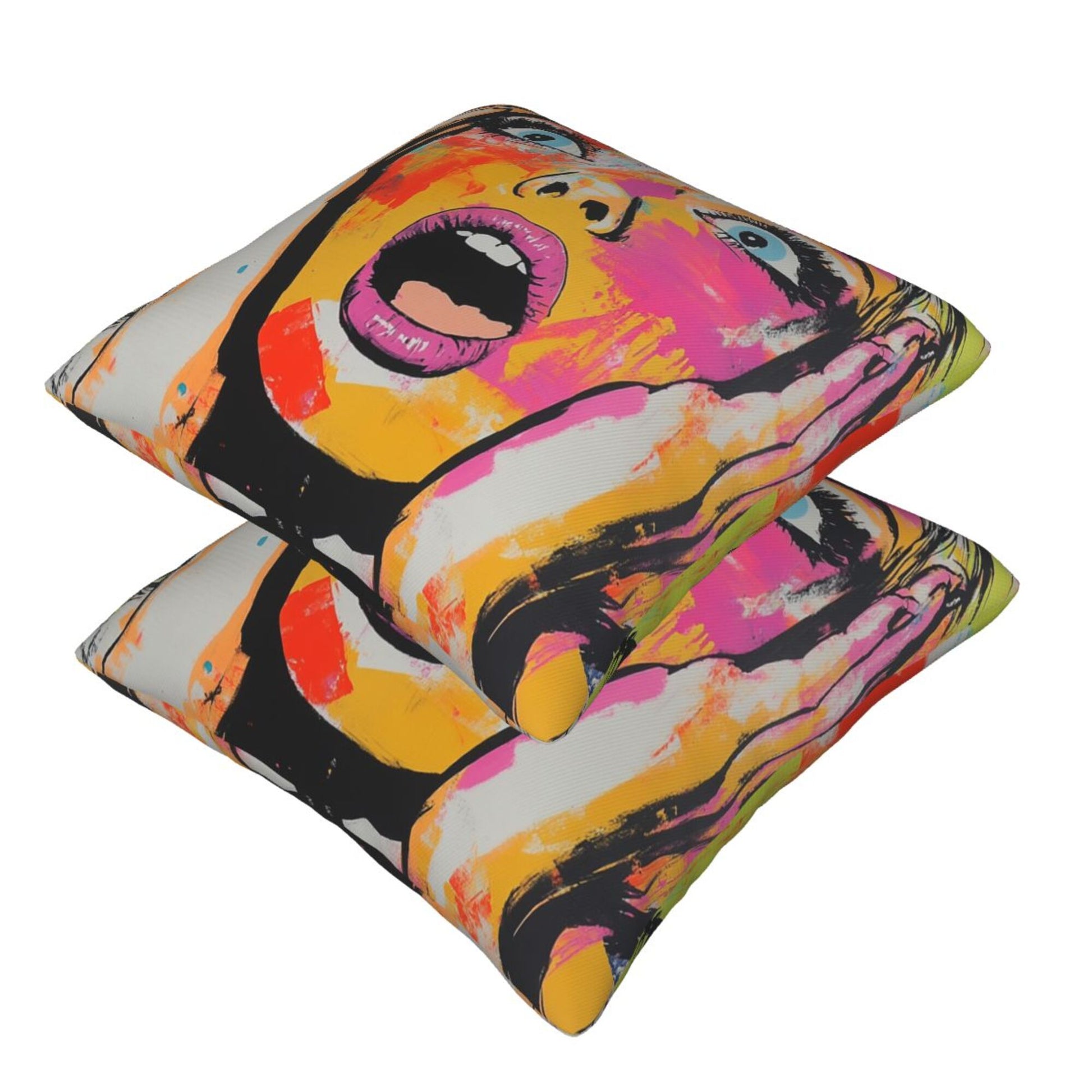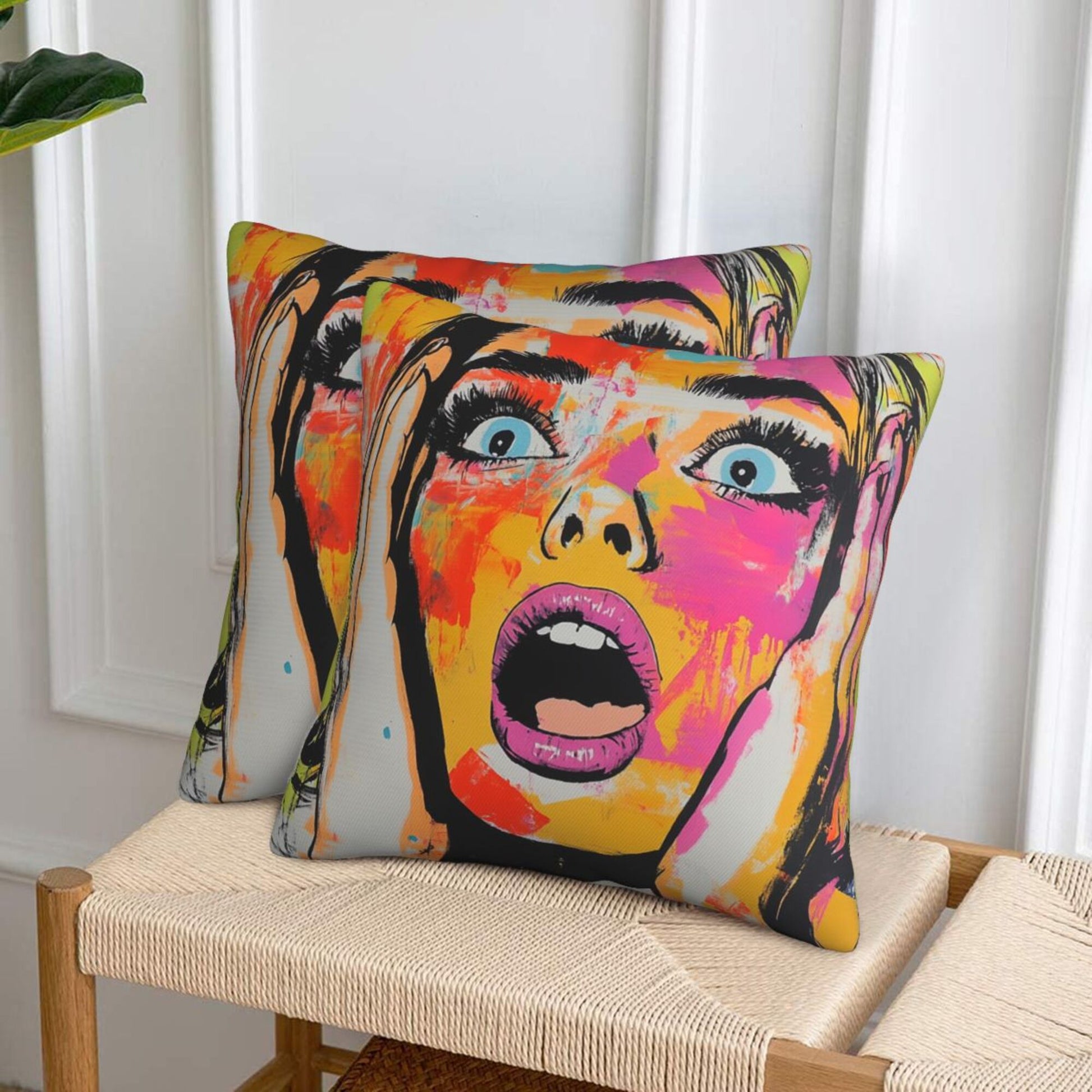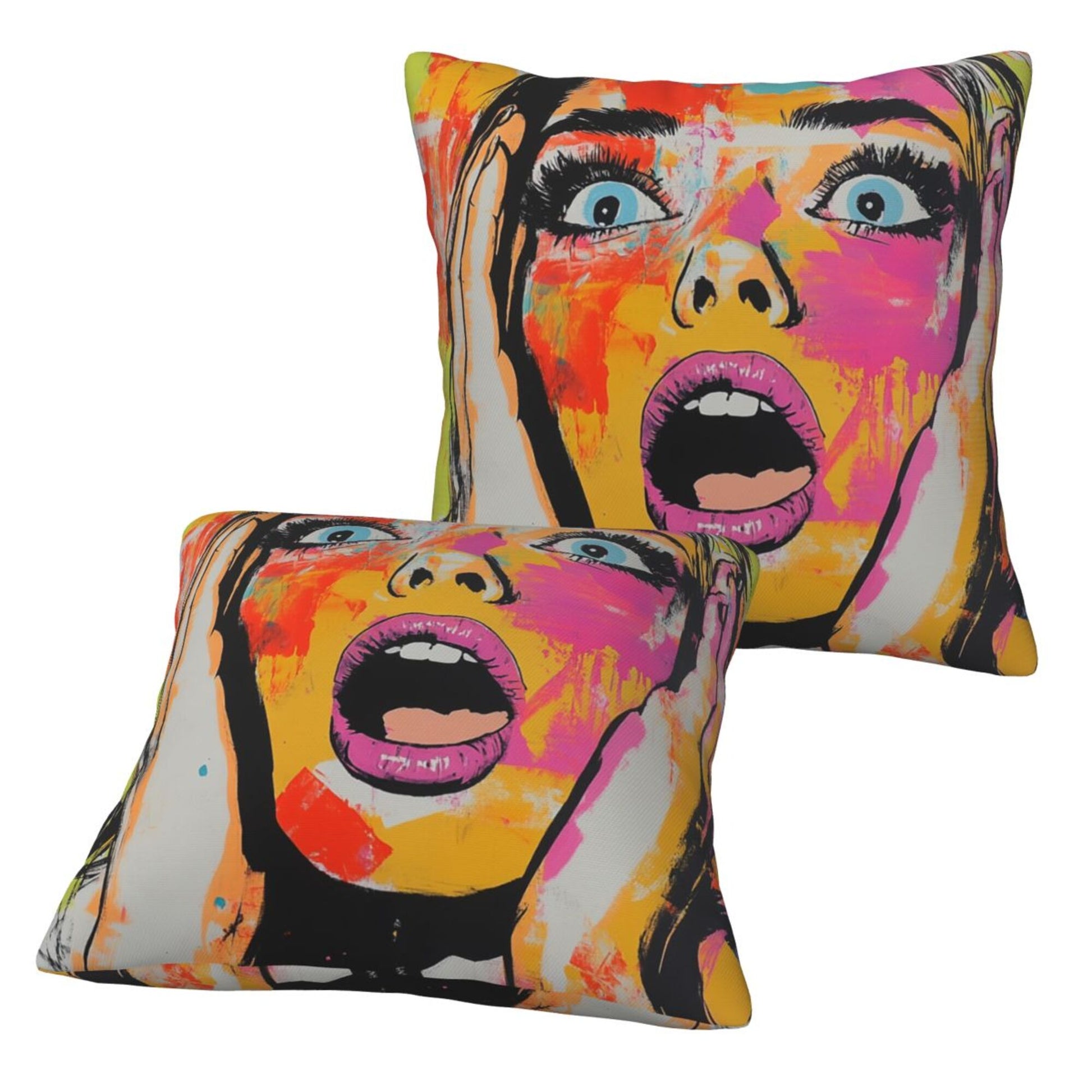 Ignite your living space with raw energy and modern expression through this 2-pack set of graffiti pop art pillow covers. Featuring a wide-eyed, open-mouthed girl rendered in vivid brushstroke textures and blazing colors, this design is an artistic statement that captures emotion, surprise, and bold personality. Inspired by contemporary urban art and street culture, the print combines vibrant pinks, oranges, yellows, electric blue, and black into a chaotic yet harmonious explosion of visual power—ideal for anyone who loves edgy decor.