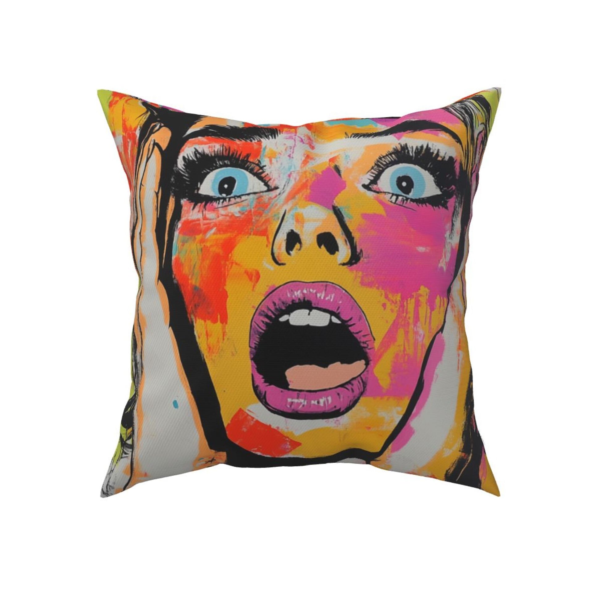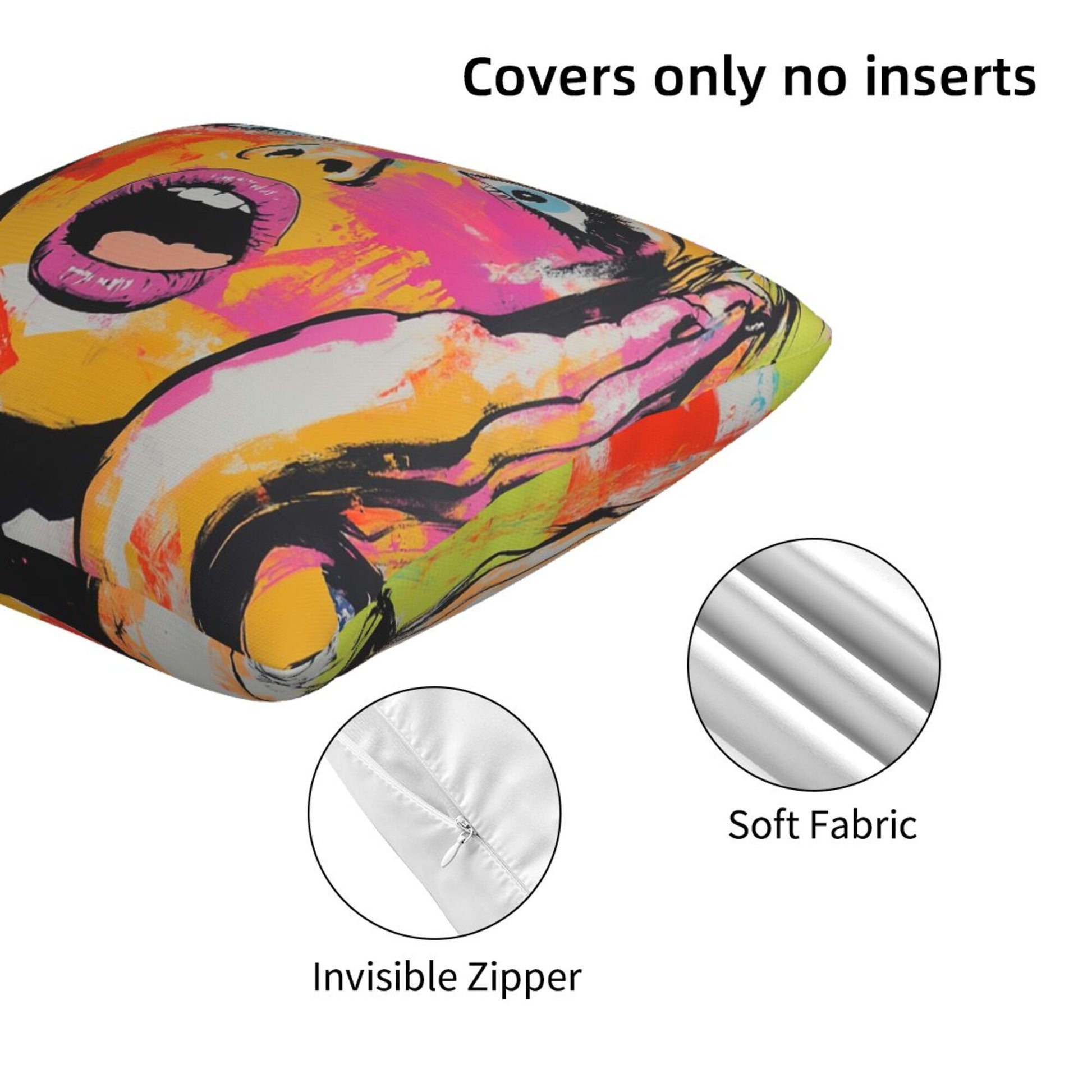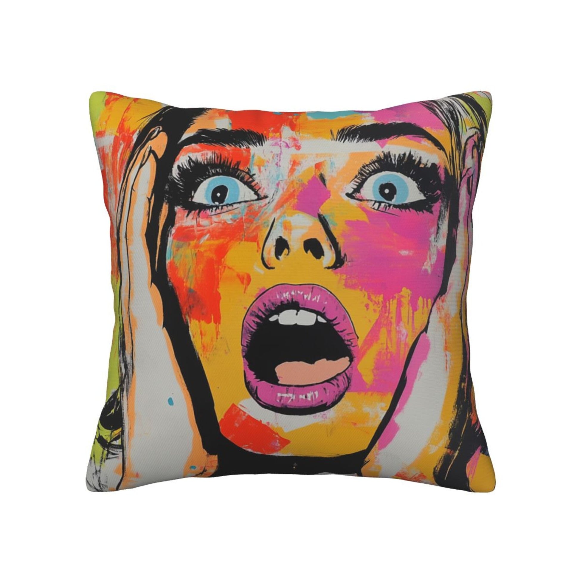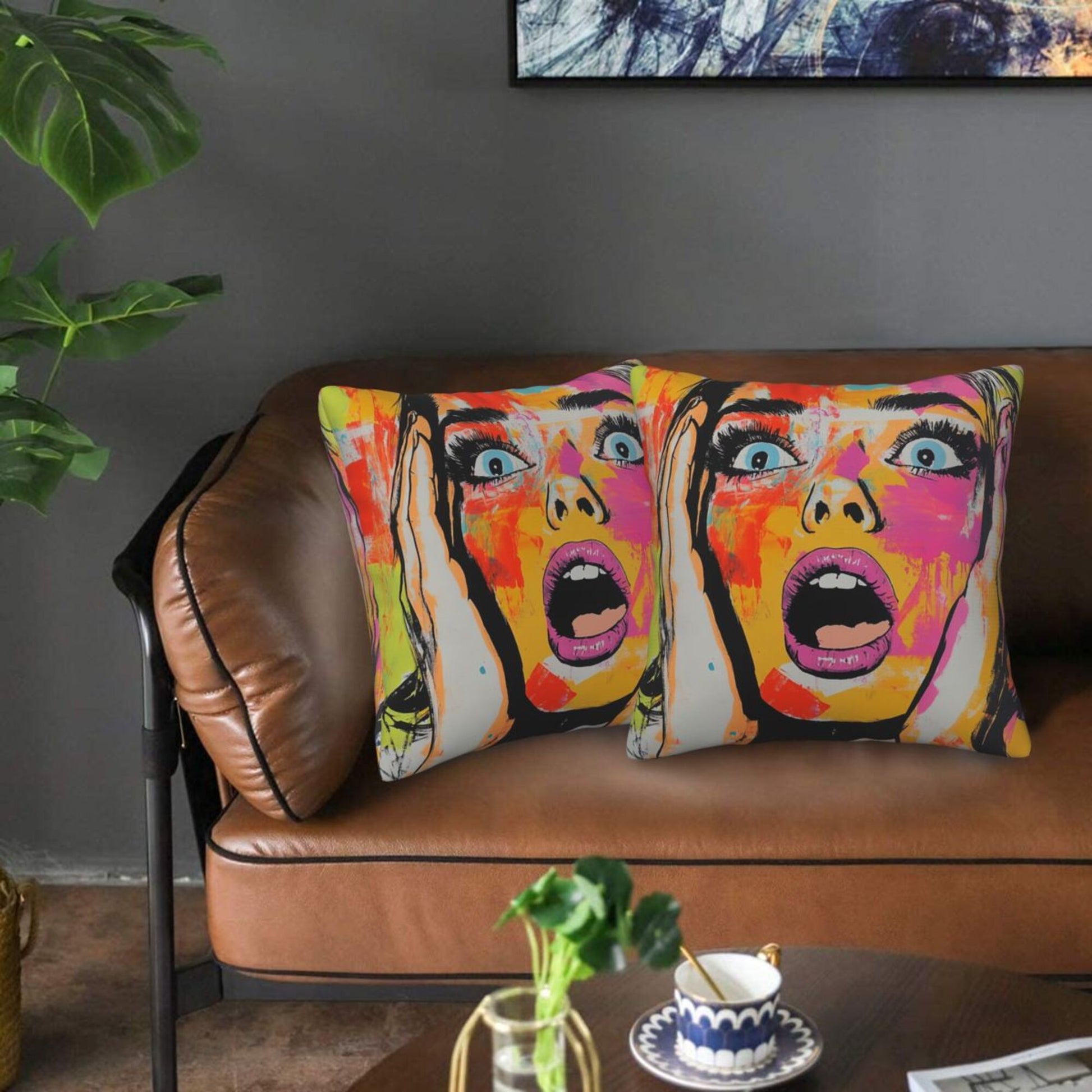 Ignite your living space with raw energy and modern expression through this 2-pack set of graffiti pop art pillow covers. Featuring a wide-eyed, open-mouthed girl rendered in vivid brushstroke textures and blazing colors, this design is an artistic statement that captures emotion, surprise, and bold personality. Inspired by contemporary urban art and street culture, the print combines vibrant pinks, oranges, yellows, electric blue, and black into a chaotic yet harmonious explosion of visual power—ideal for anyone who loves edgy decor.