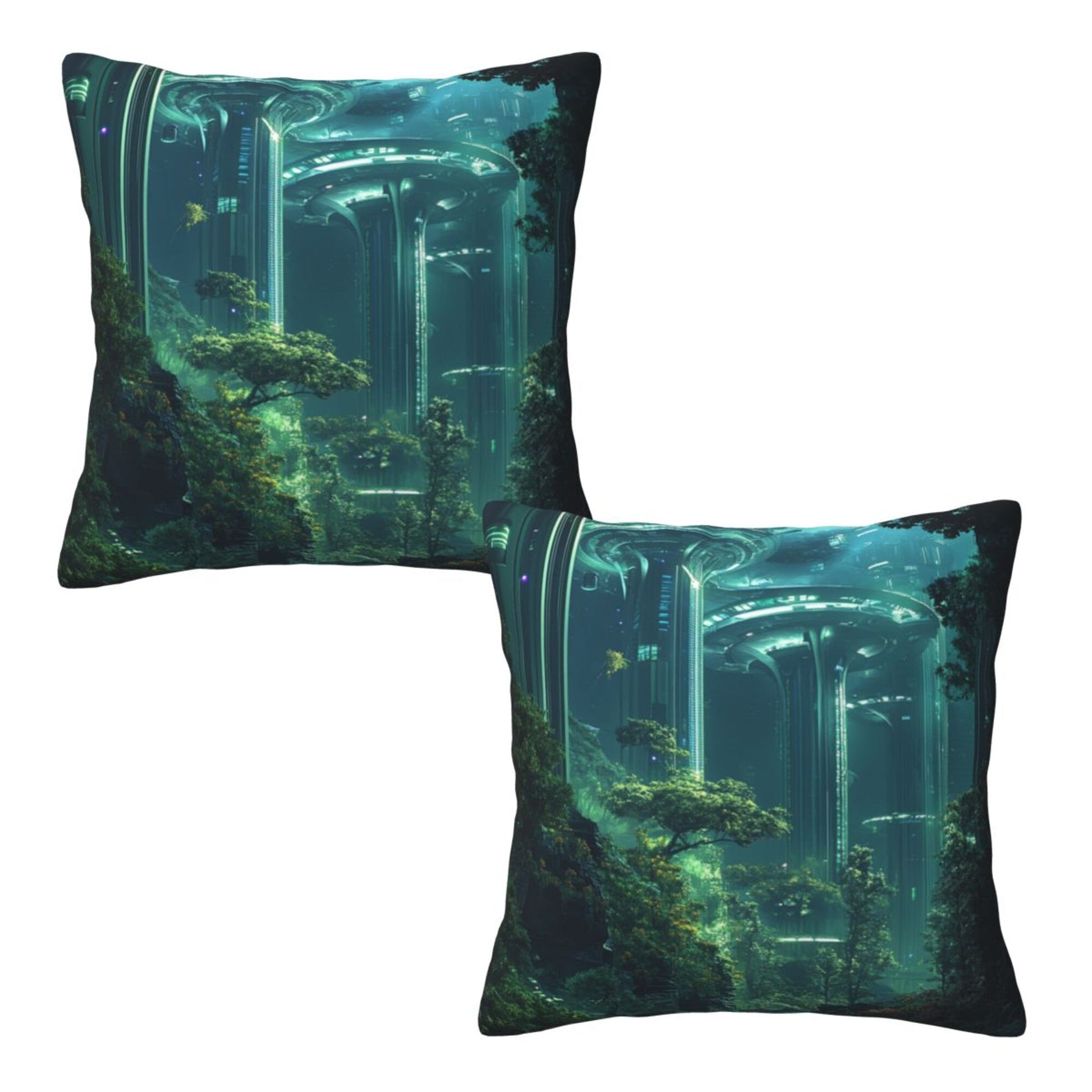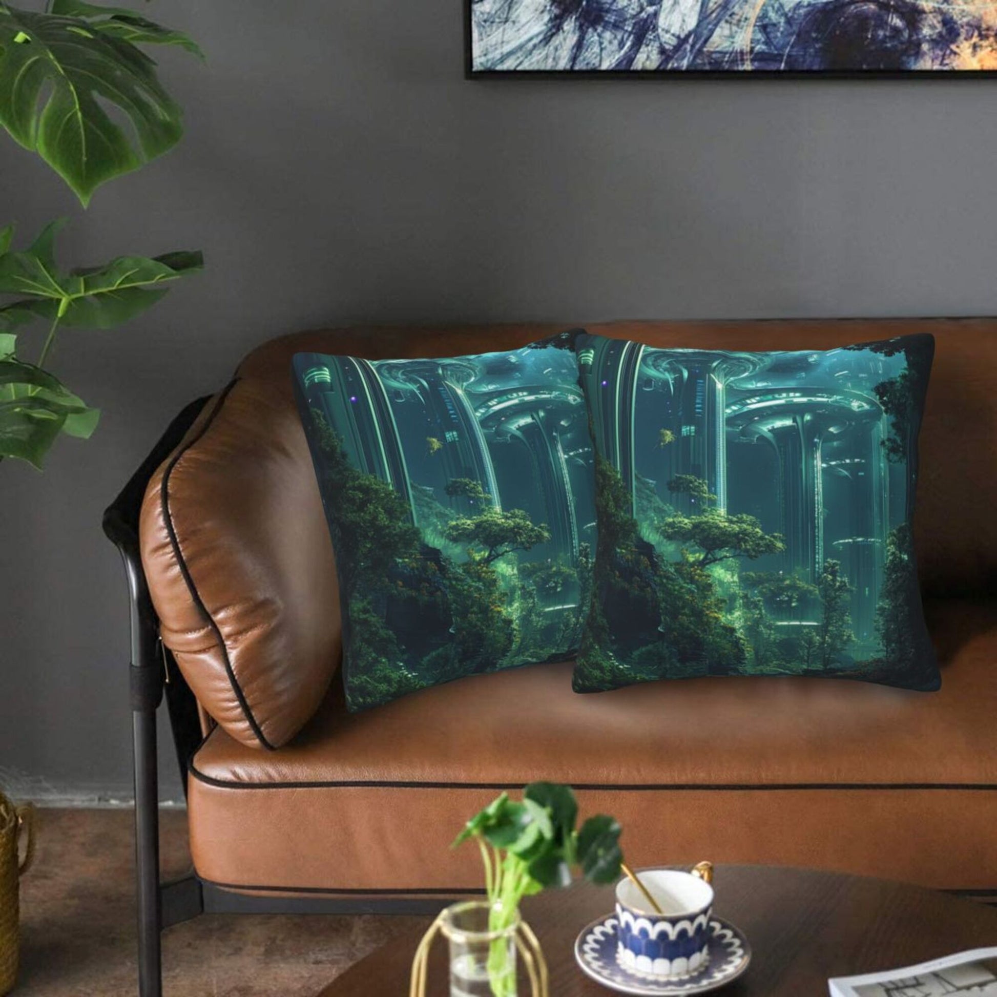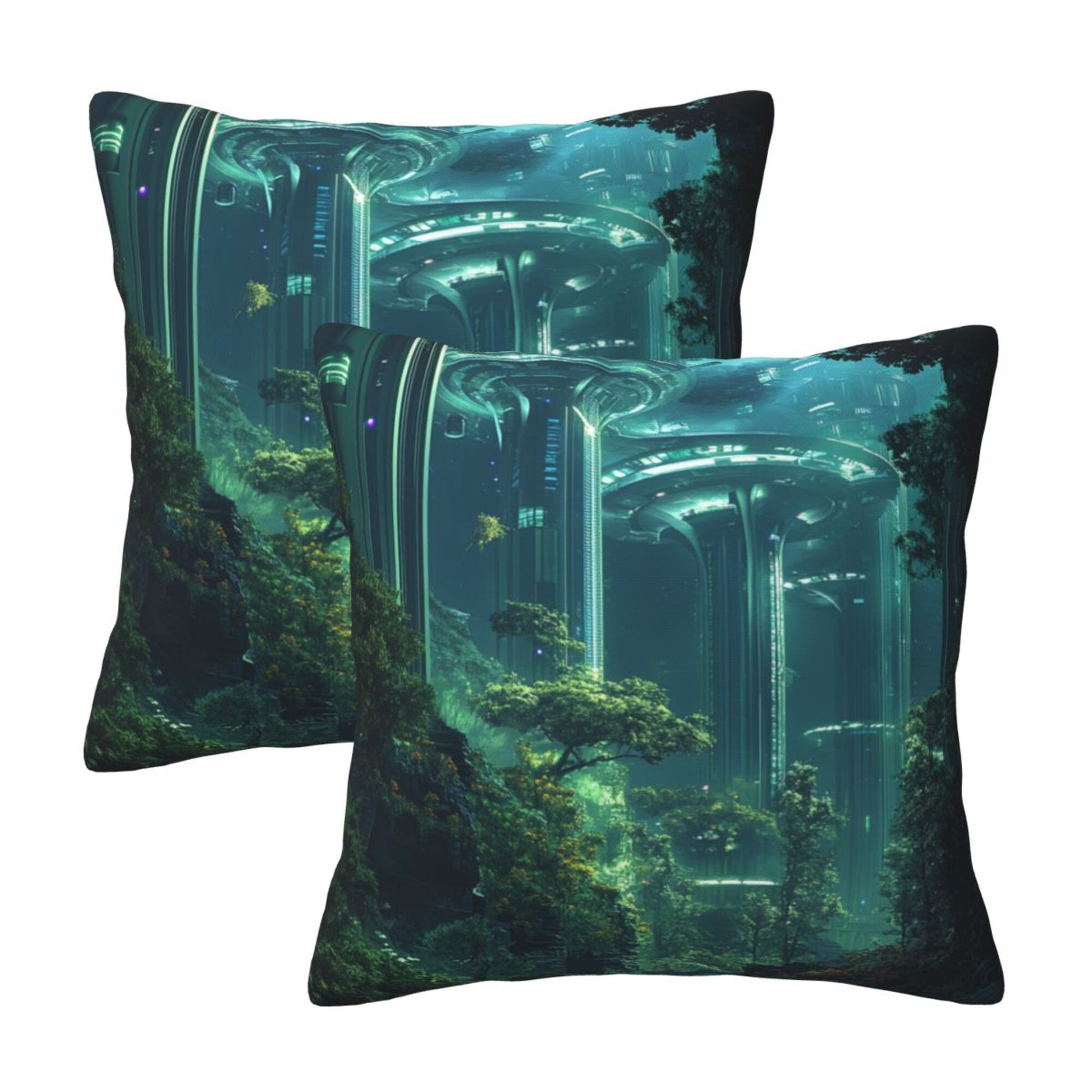 Set of 2 Futuristic Sci-Fi Forest Pillow Covers – 18x18 Inch Green Tech City Decorative Cushion Covers for Sofa Couch Bed (No Inserts)