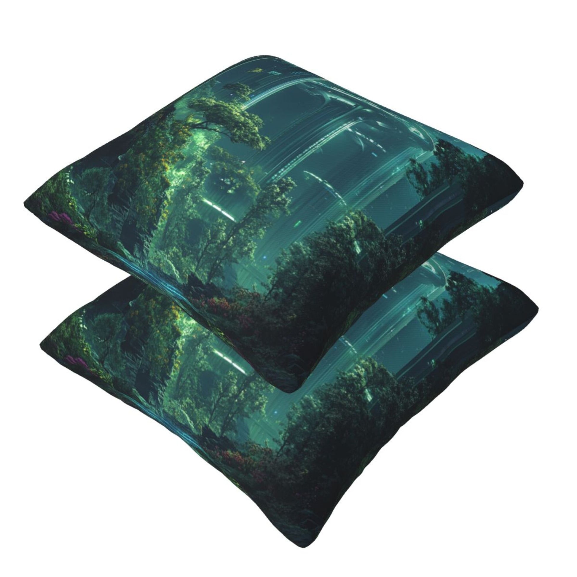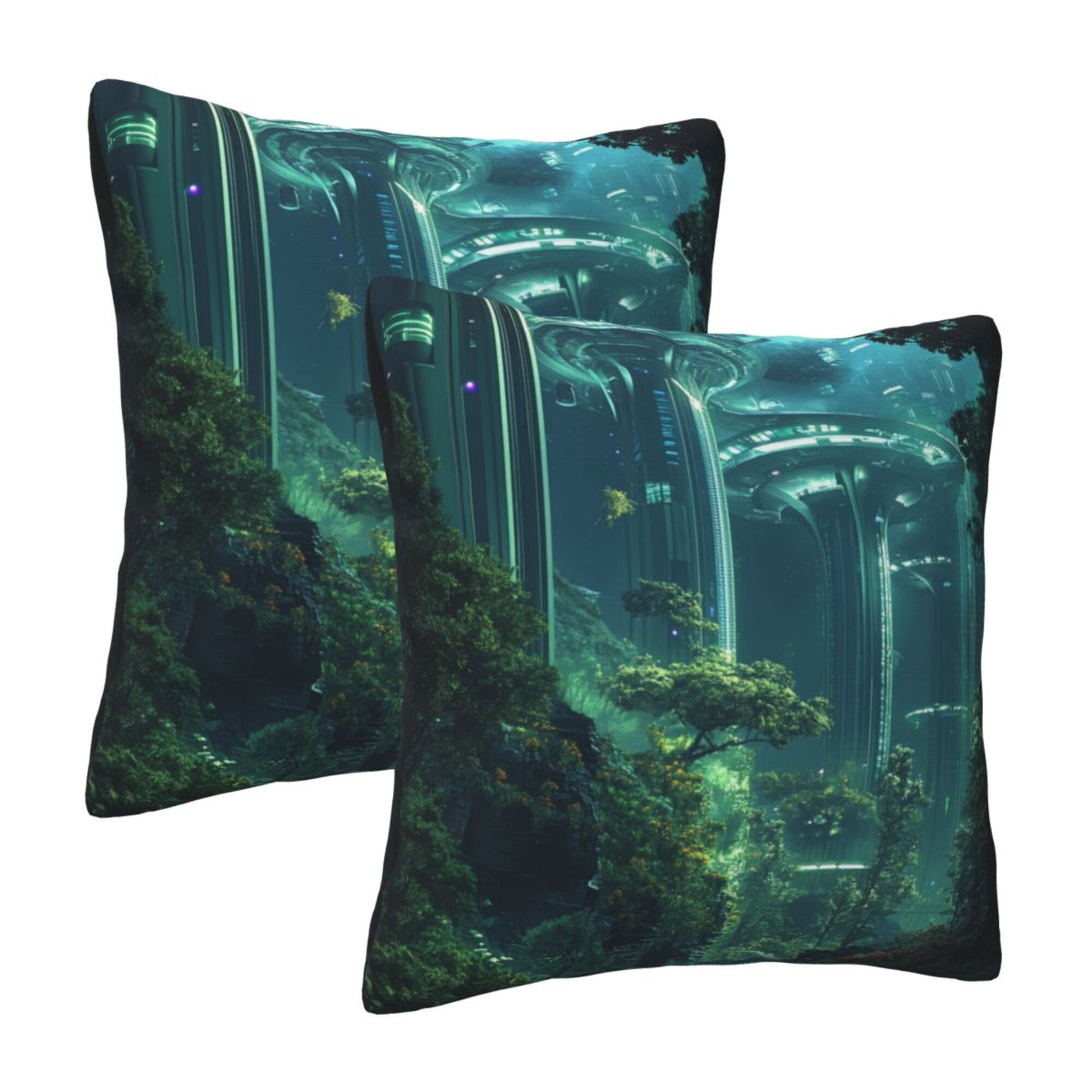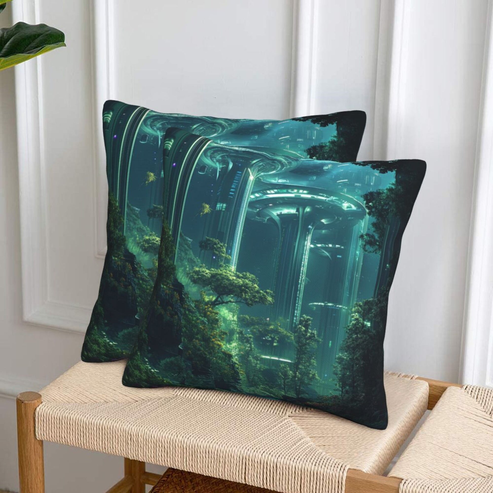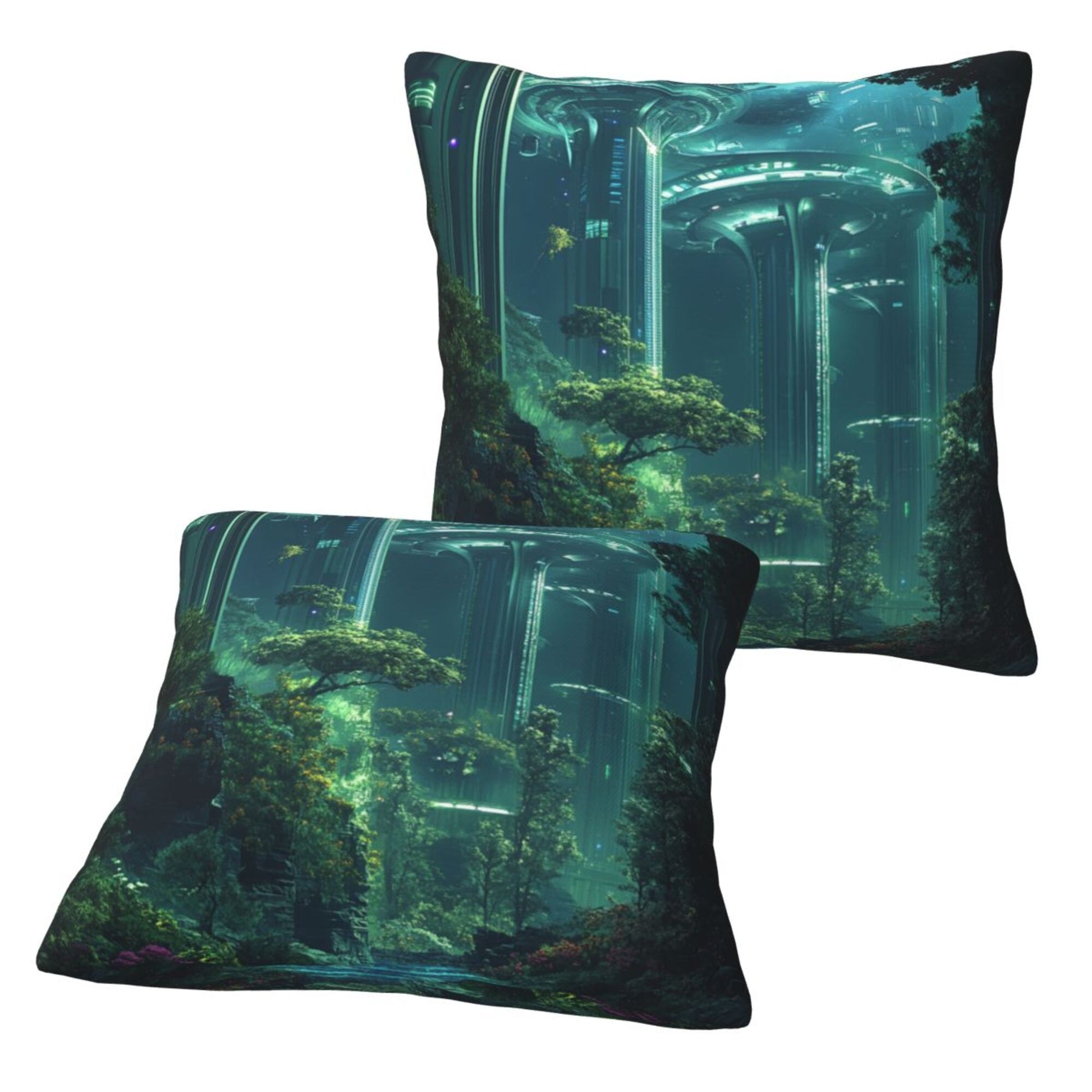 Set of 2 Futuristic Sci-Fi Forest Pillow Covers – 18x18 Inch Green Tech City Decorative Cushion Covers for Sofa Couch Bed (No Inserts)