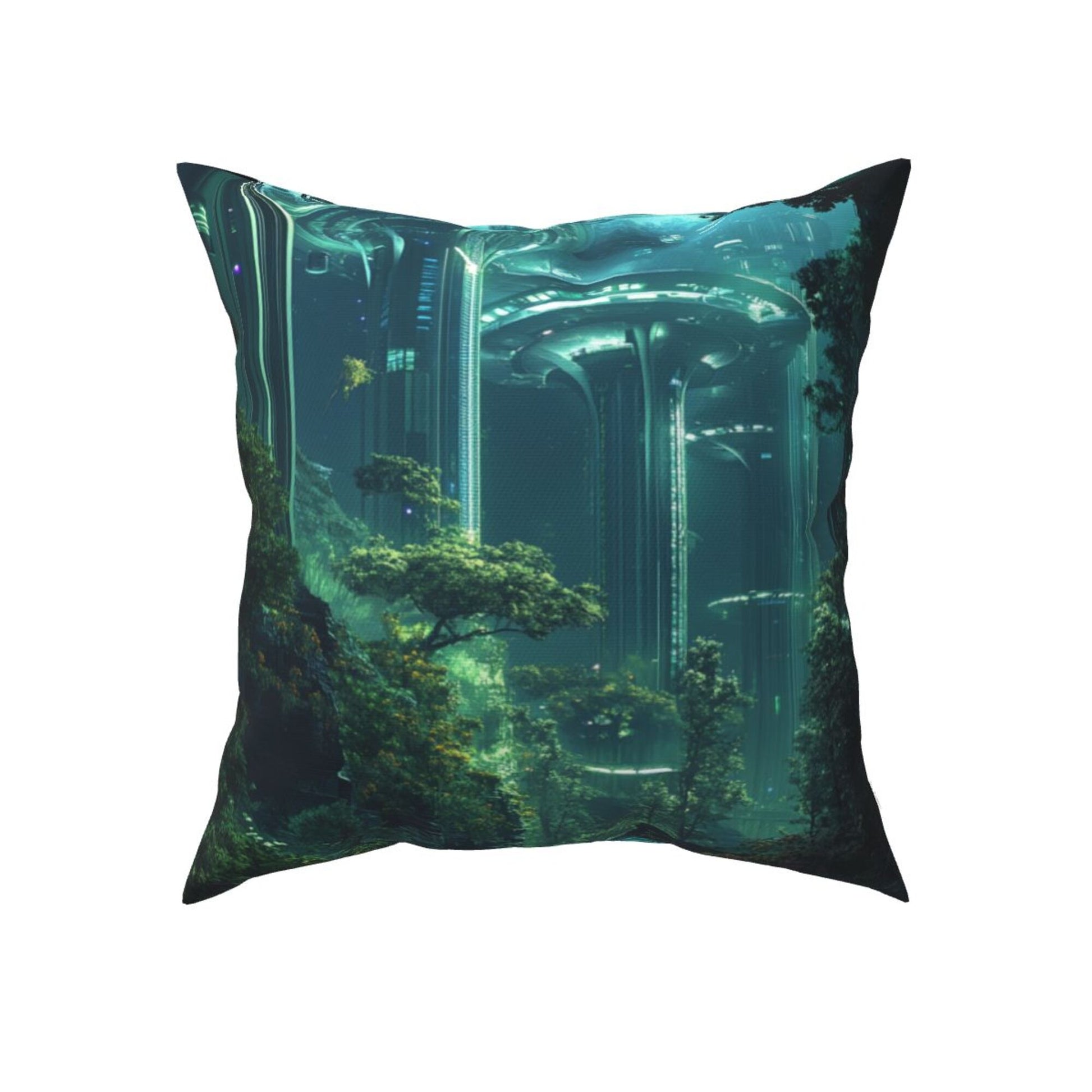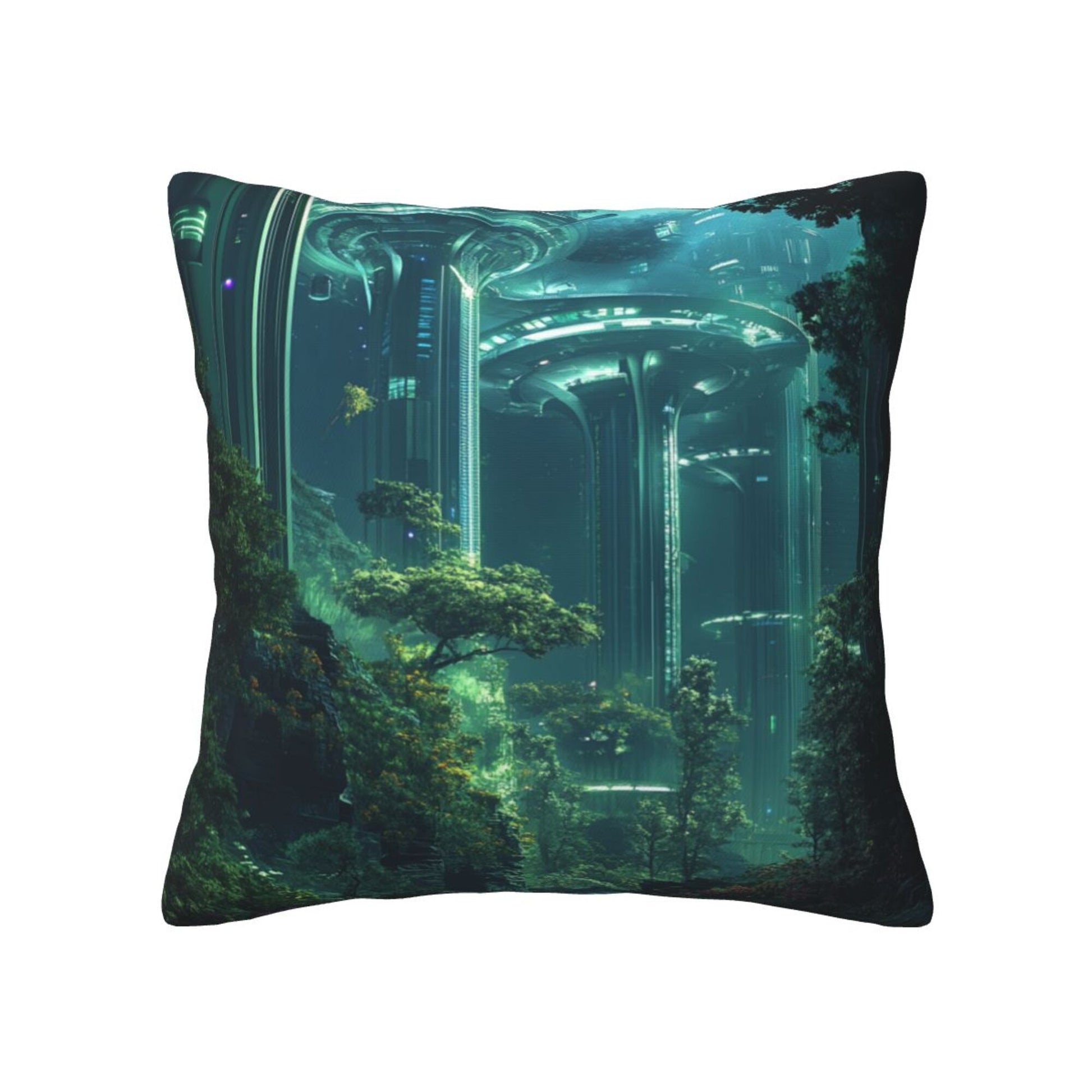 Step into a future beyond imagination with this stunning set of pillow covers featuring a visionary green sci-fi city deep within a forested realm. The design showcases towering futuristic structures that seem to float above the lush canopy, illuminated with surreal glowing lights in vibrant shades of teal and emerald. The perfect fusion of nature and technology, this artwork creates a captivating narrative of harmony between advanced civilizations and untouched wilderness.