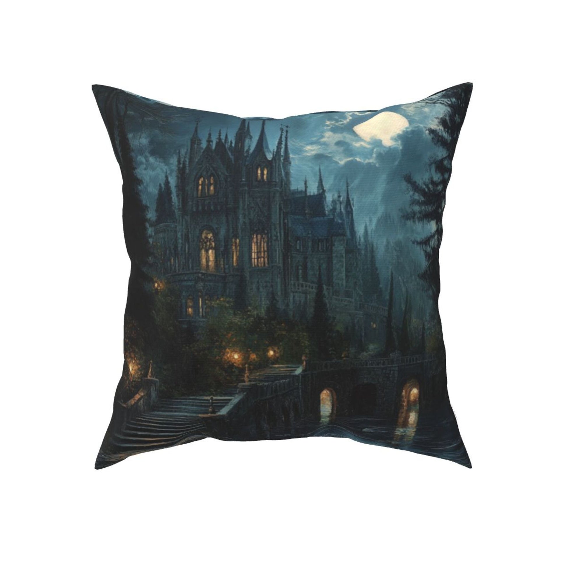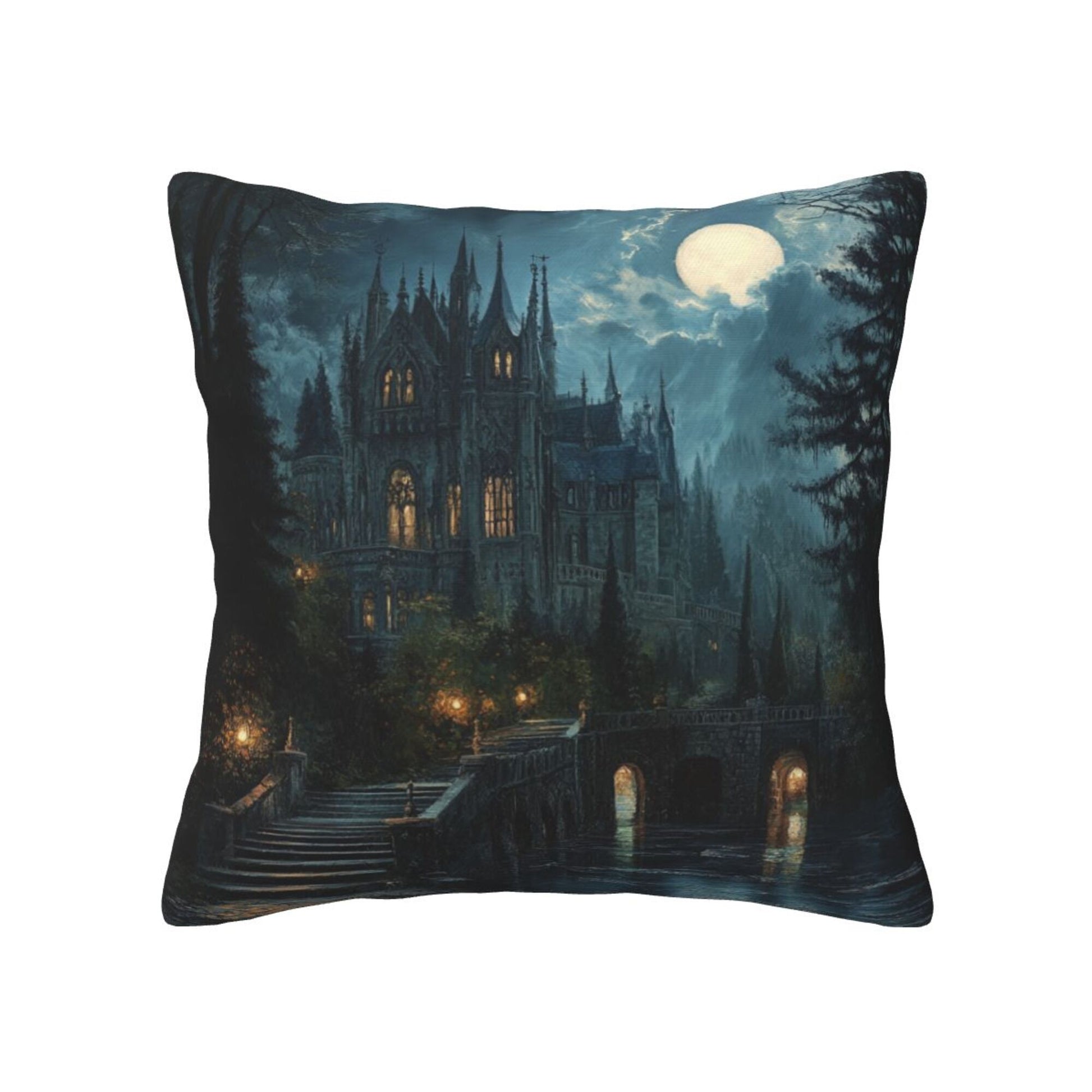 Transform your space into a mysterious fantasy realm with this set of Gothic moonlit castle pillow covers. The design features a majestic cathedral-like castle illuminated under a glowing full moon, nestled among towering evergreens and reflected softly on the still water below. The intricate staircase and dimly lit windows evoke a haunting yet elegant ambiance, reminiscent of magical realms, enchanted schools, or classic dark fantasy movies. Perfect for gothic interiors, fantasy-themed décor, or anyone drawn to mysterious nocturnal beauty.