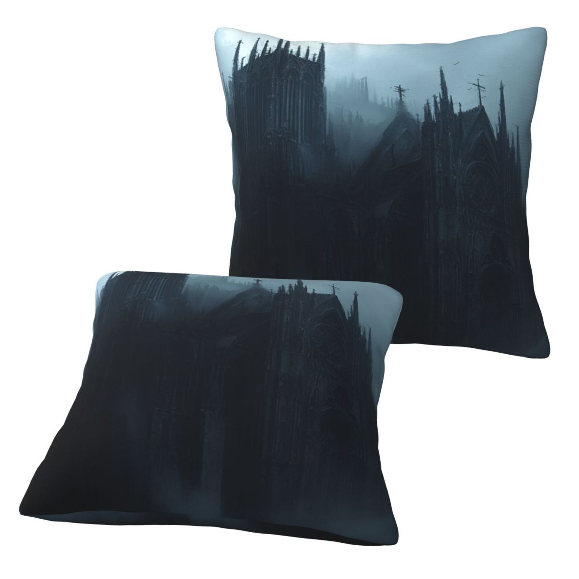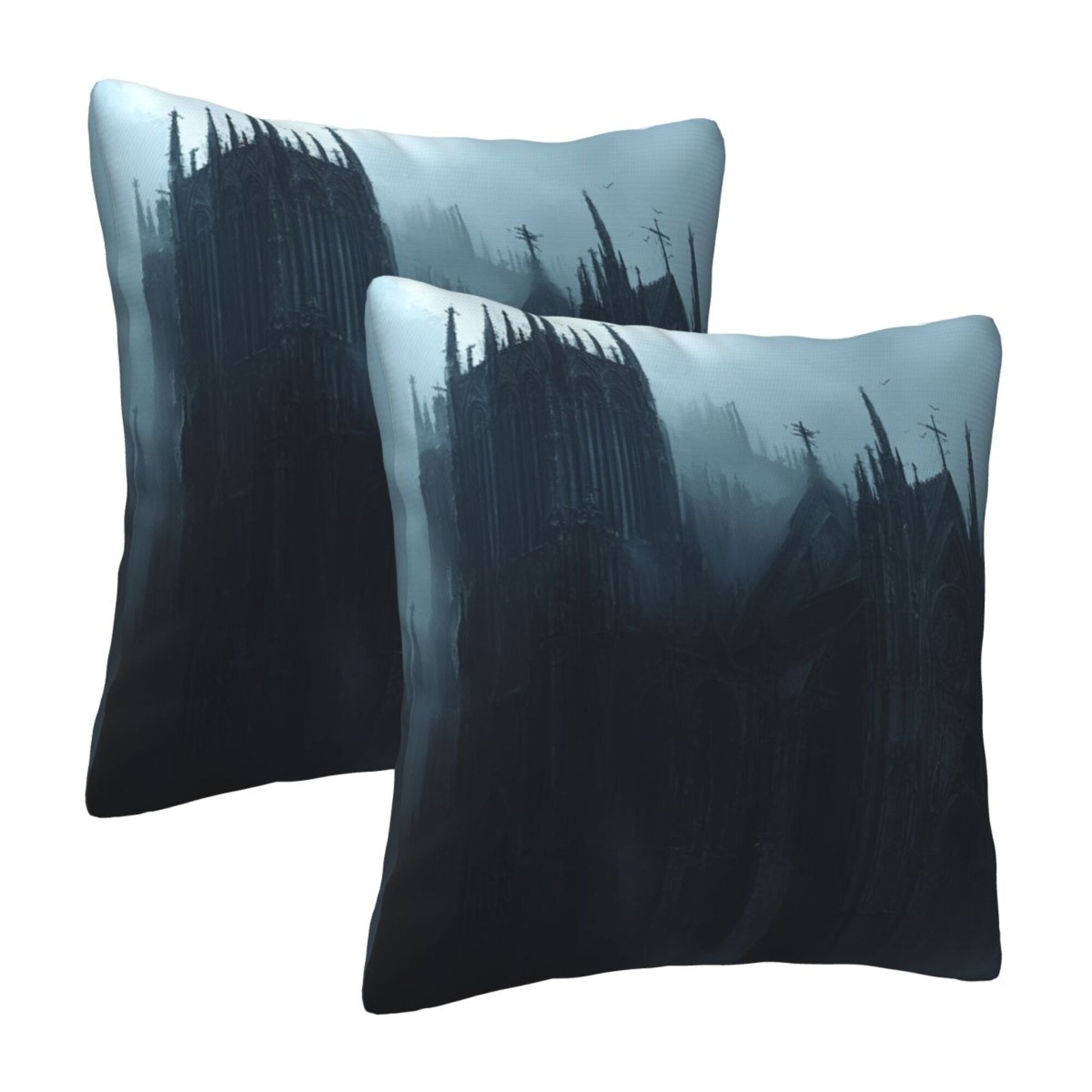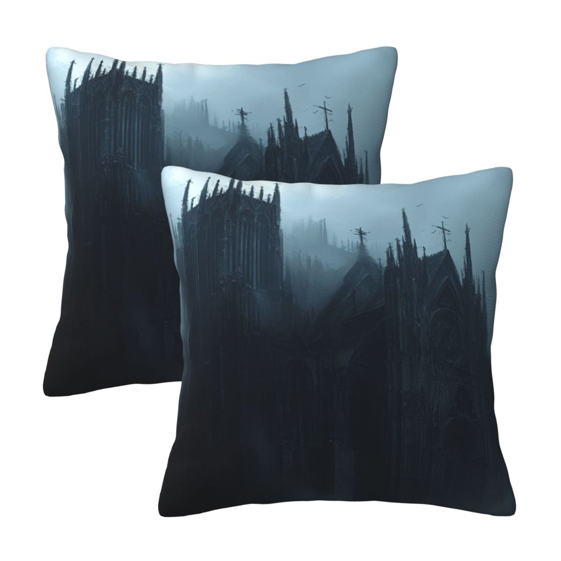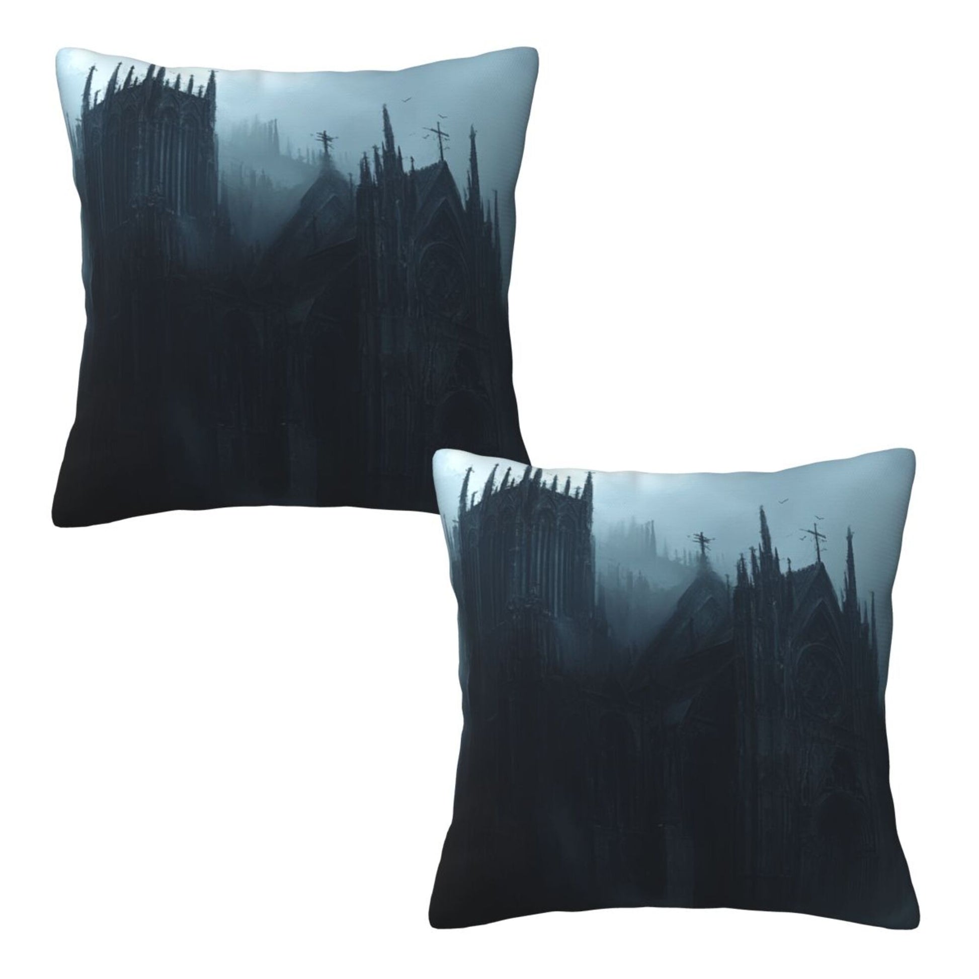 Embrace the shadowed beauty of gothic architecture with this stunning set of 2 pillow covers. Featuring an eerie, mist-shrouded cathedral nestled within dark, towering pines, the design evokes the haunting majesty of a forgotten realm. The towering spires, pointed arches, and bleak color palette of deep grays and cold blues create a brooding atmosphere that invites the imagination to wander into tales of magic, mystery, and forgotten history.