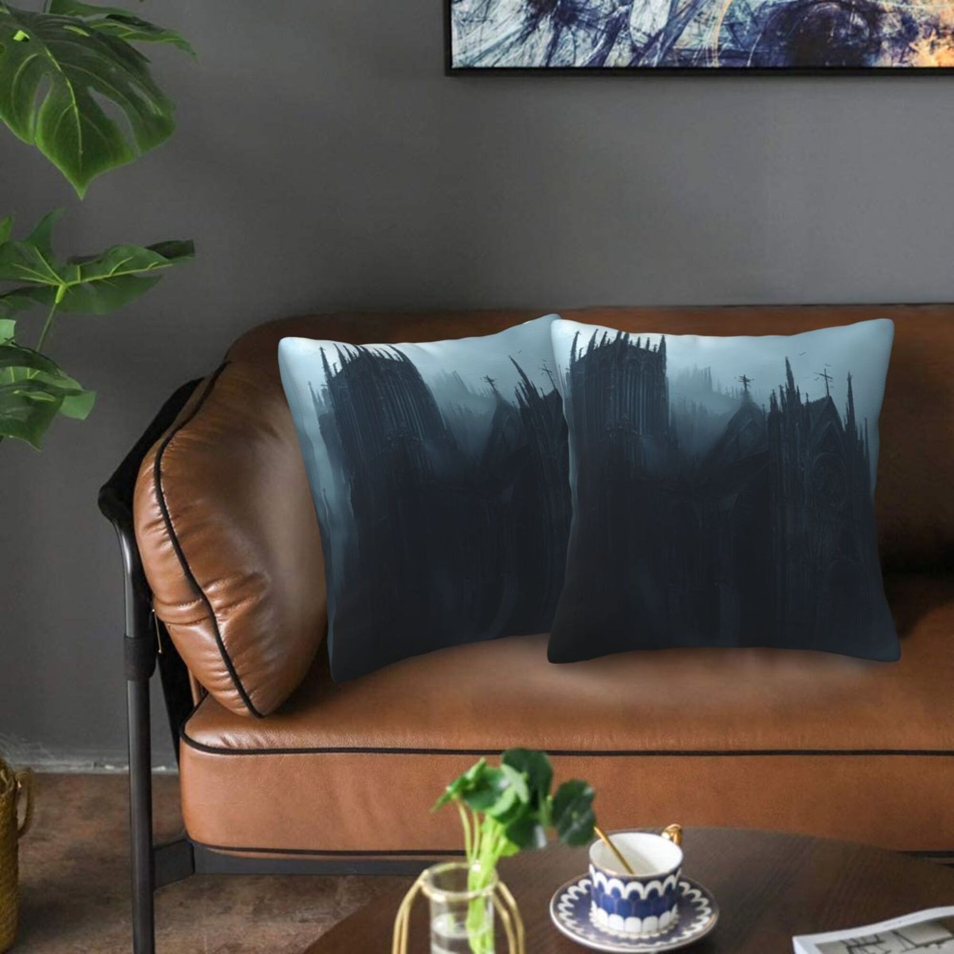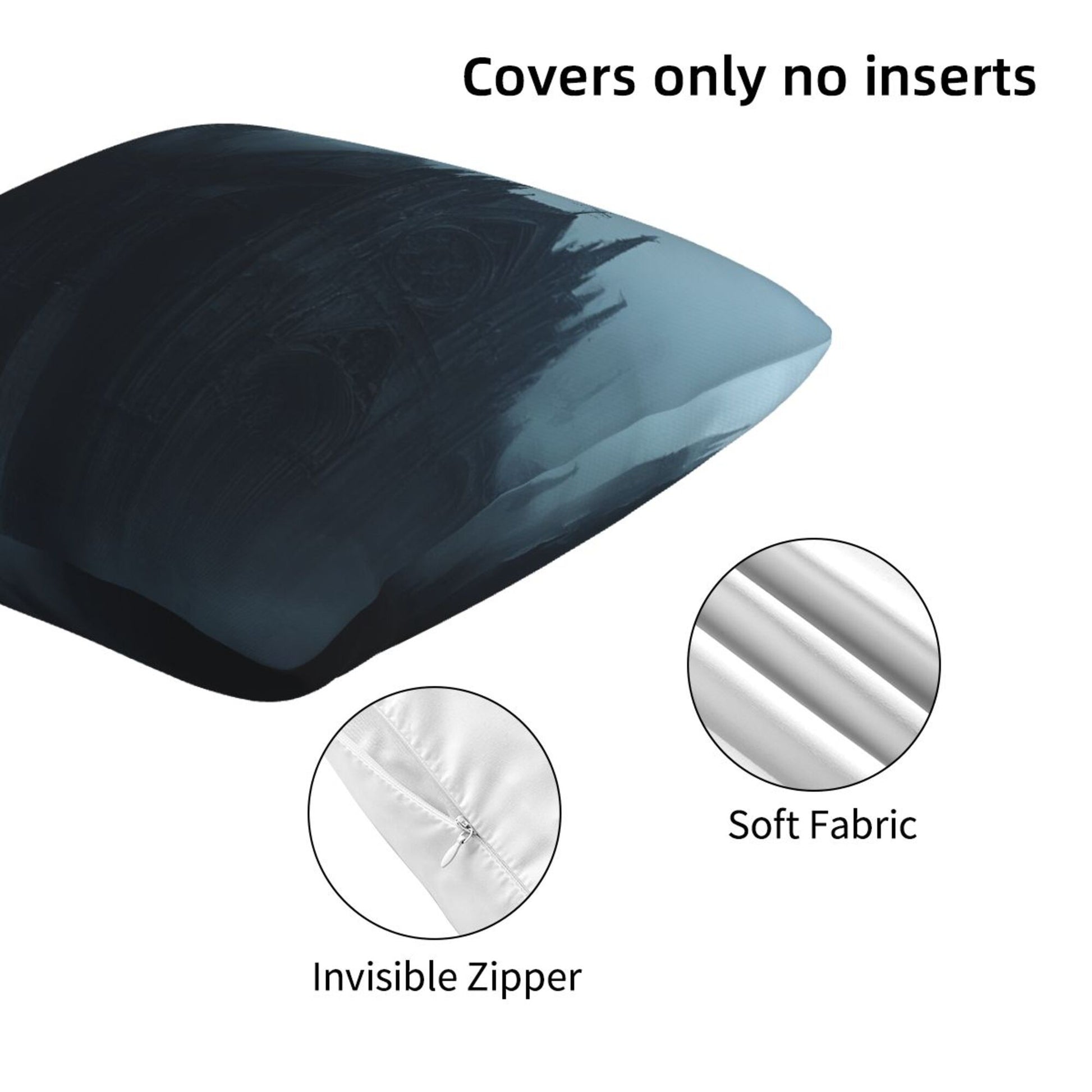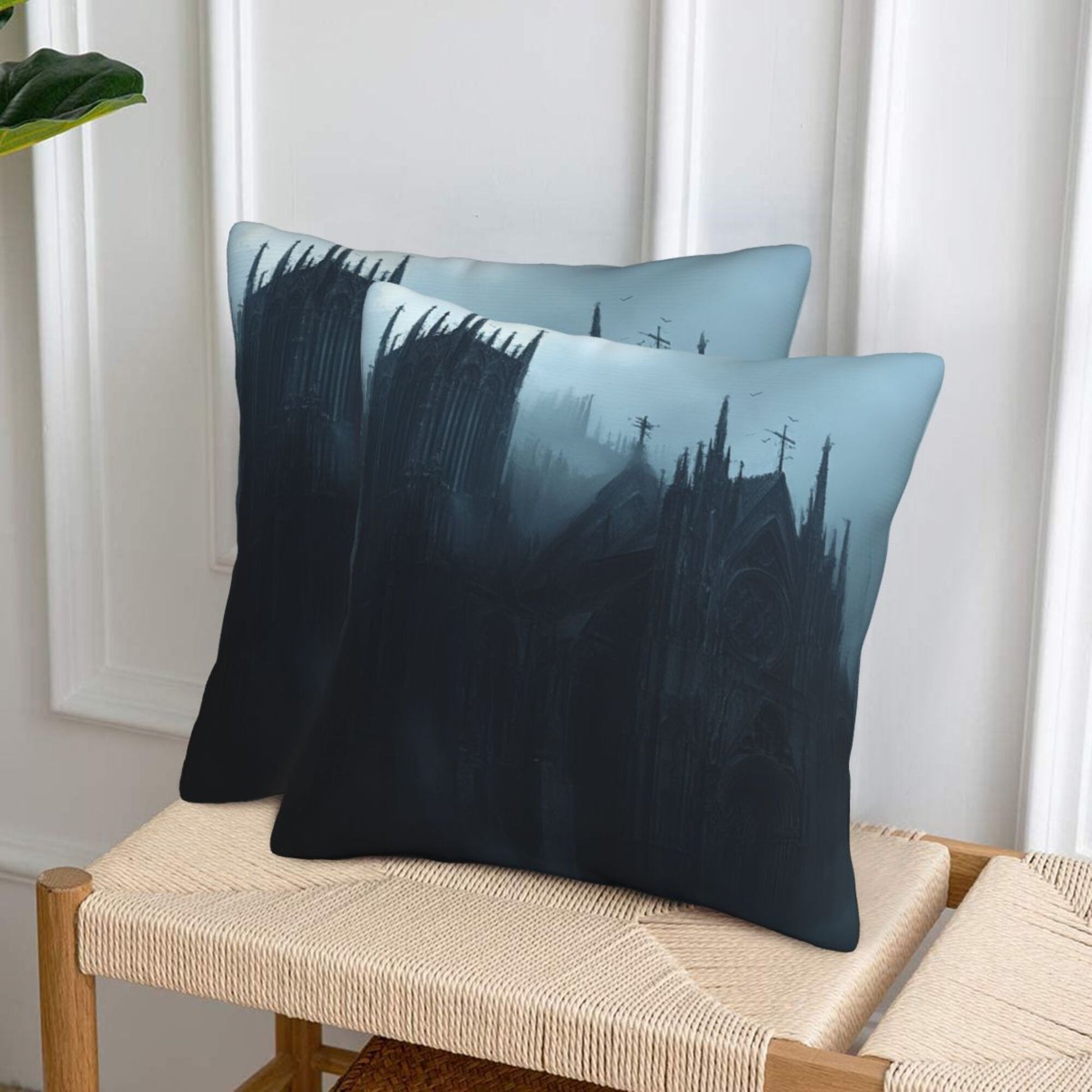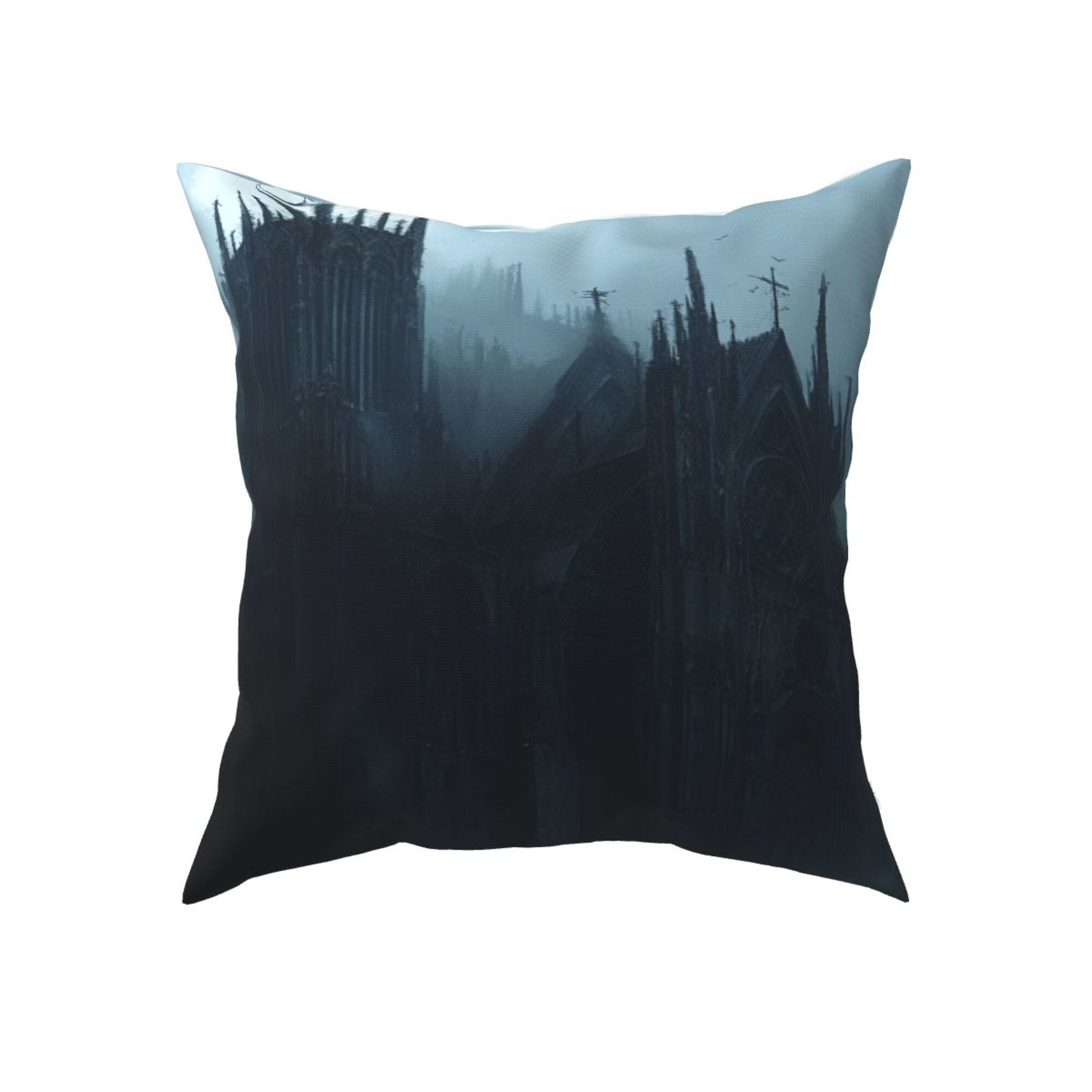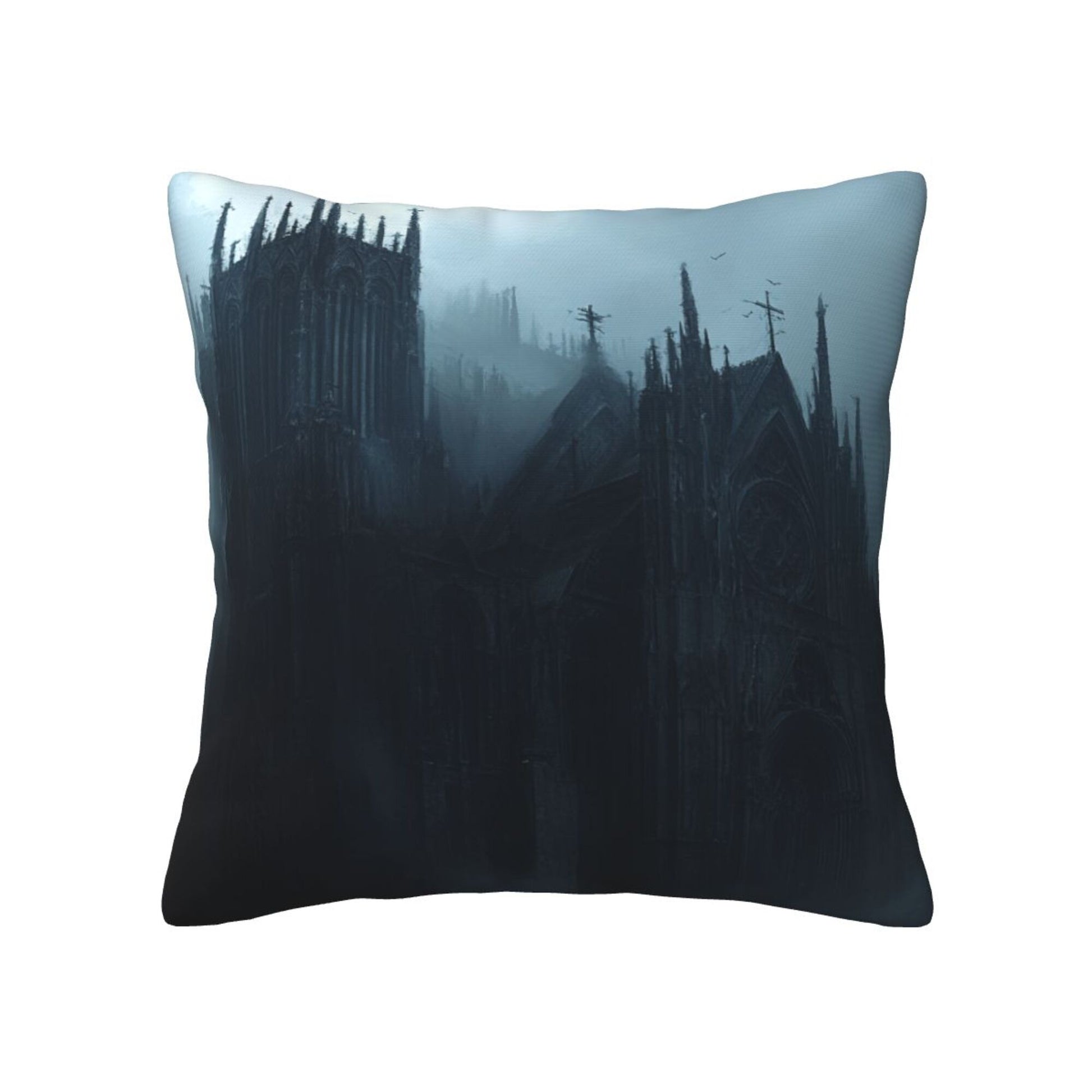 Embrace the shadowed beauty of gothic architecture with this stunning set of 2 pillow covers. Featuring an eerie, mist-shrouded cathedral nestled within dark, towering pines, the design evokes the haunting majesty of a forgotten realm. The towering spires, pointed arches, and bleak color palette of deep grays and cold blues create a brooding atmosphere that invites the imagination to wander into tales of magic, mystery, and forgotten history.