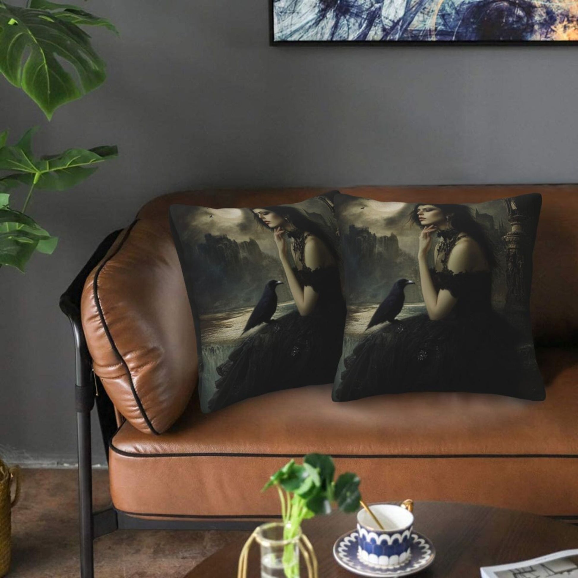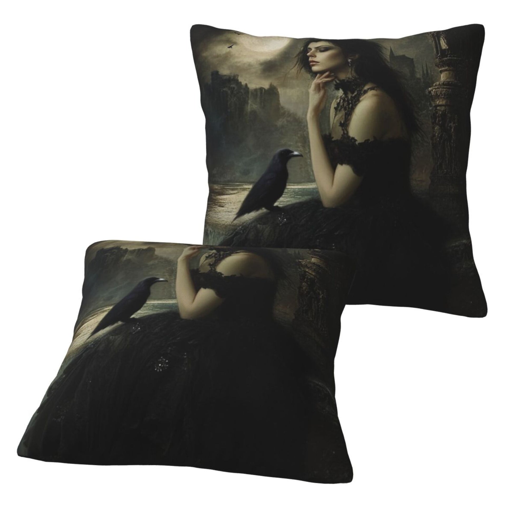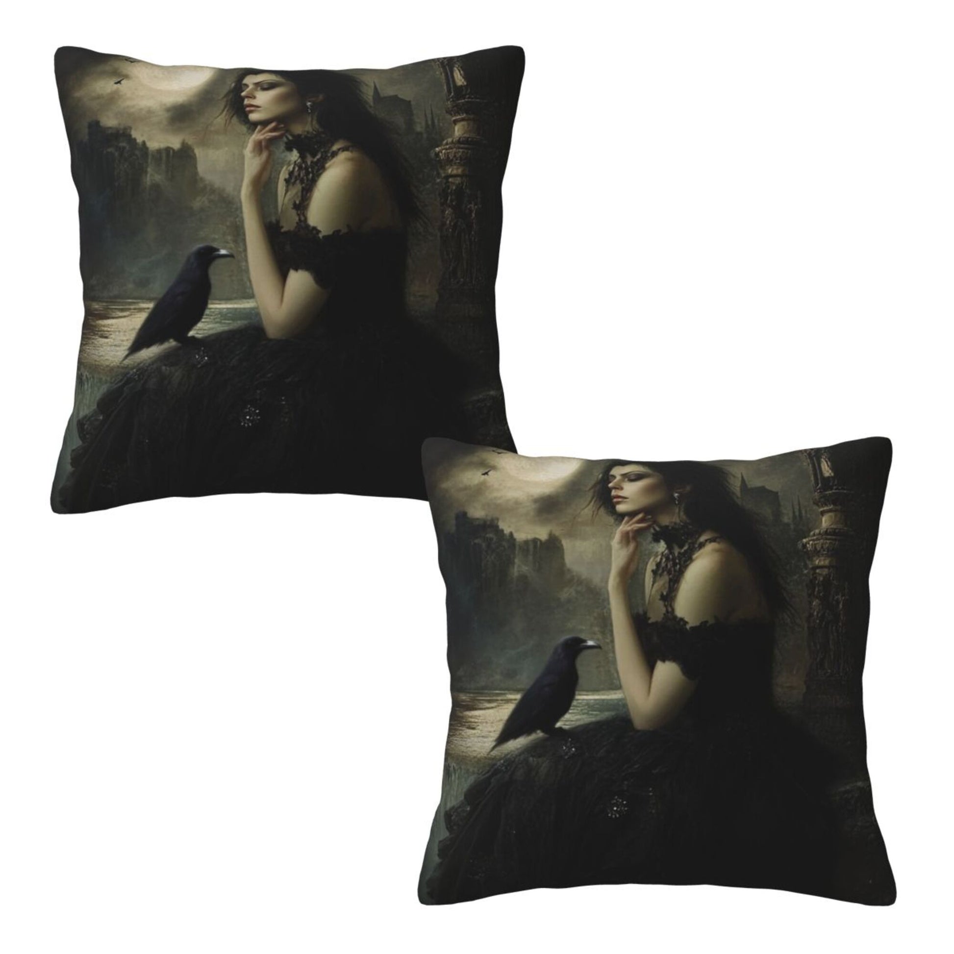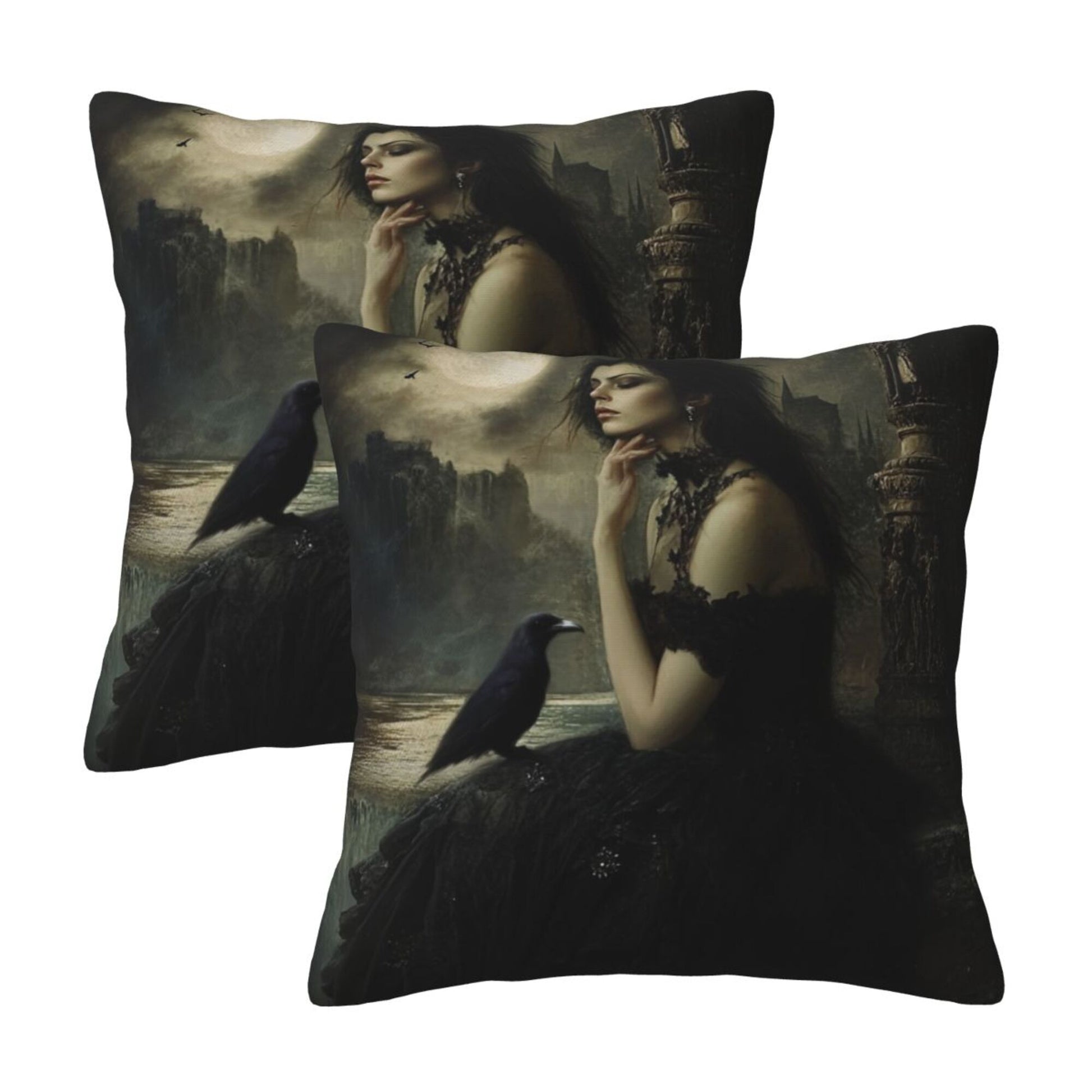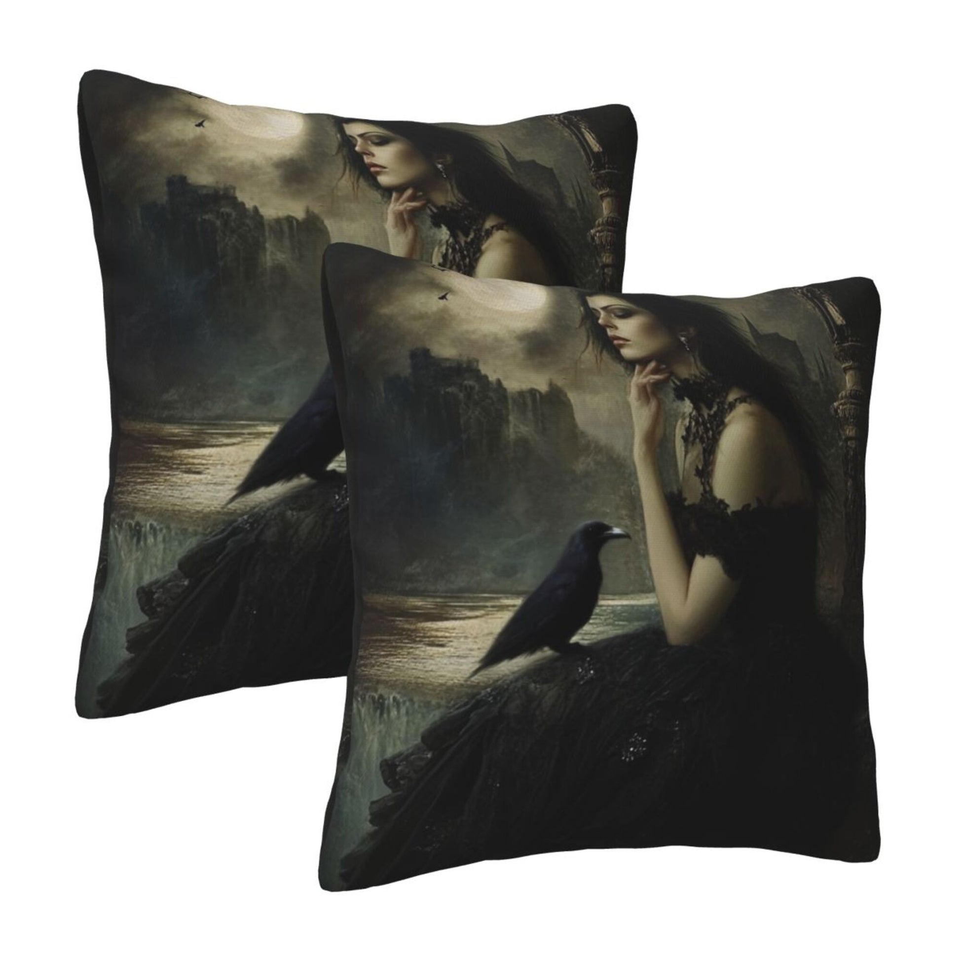 Set of 2 Gothic Witch Pillow Covers – 18x18 Inch Dark Fantasy Lady with Raven Decorative Throw Pillowcases (No Inserts)