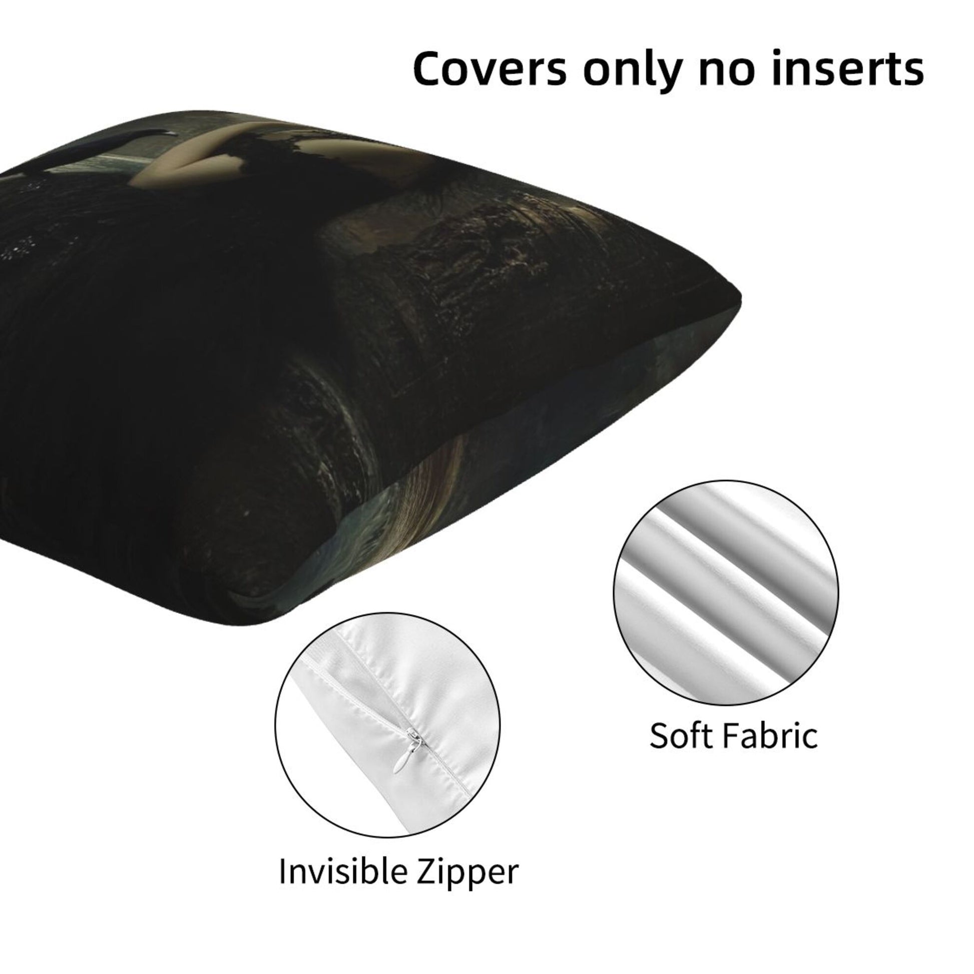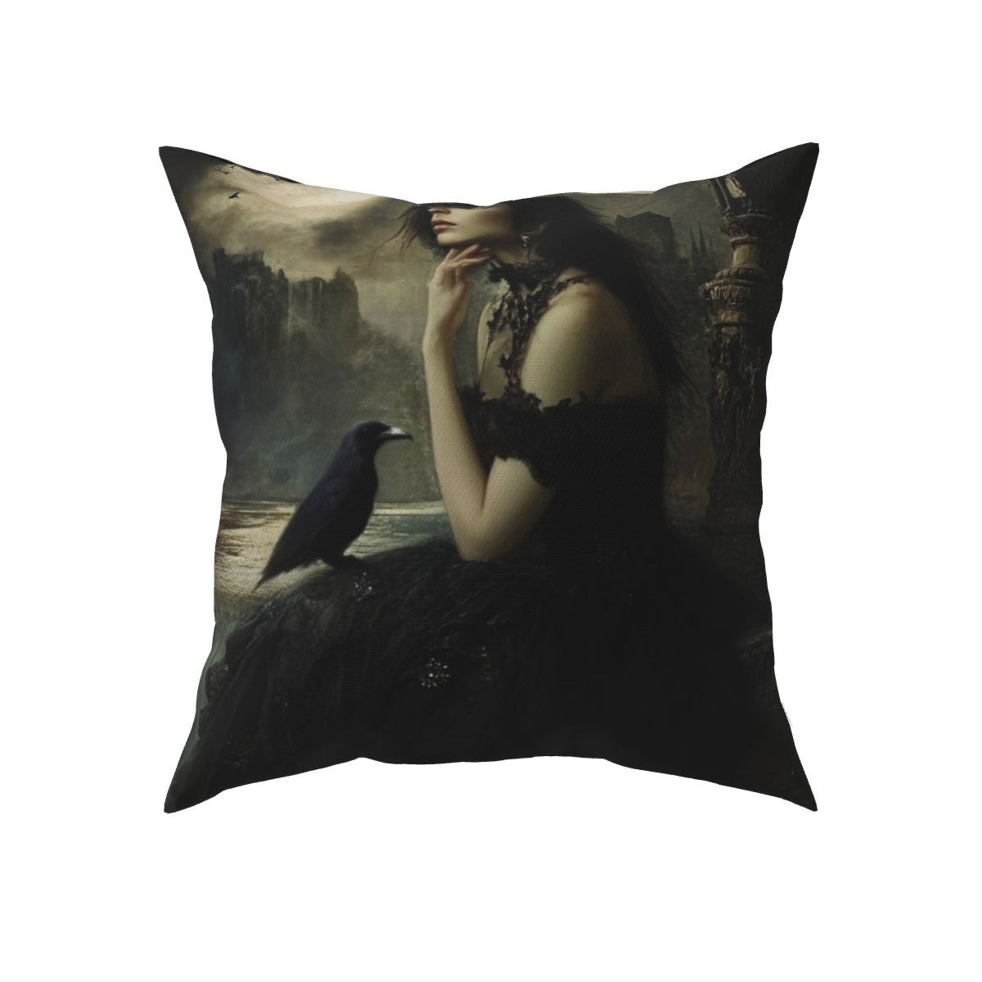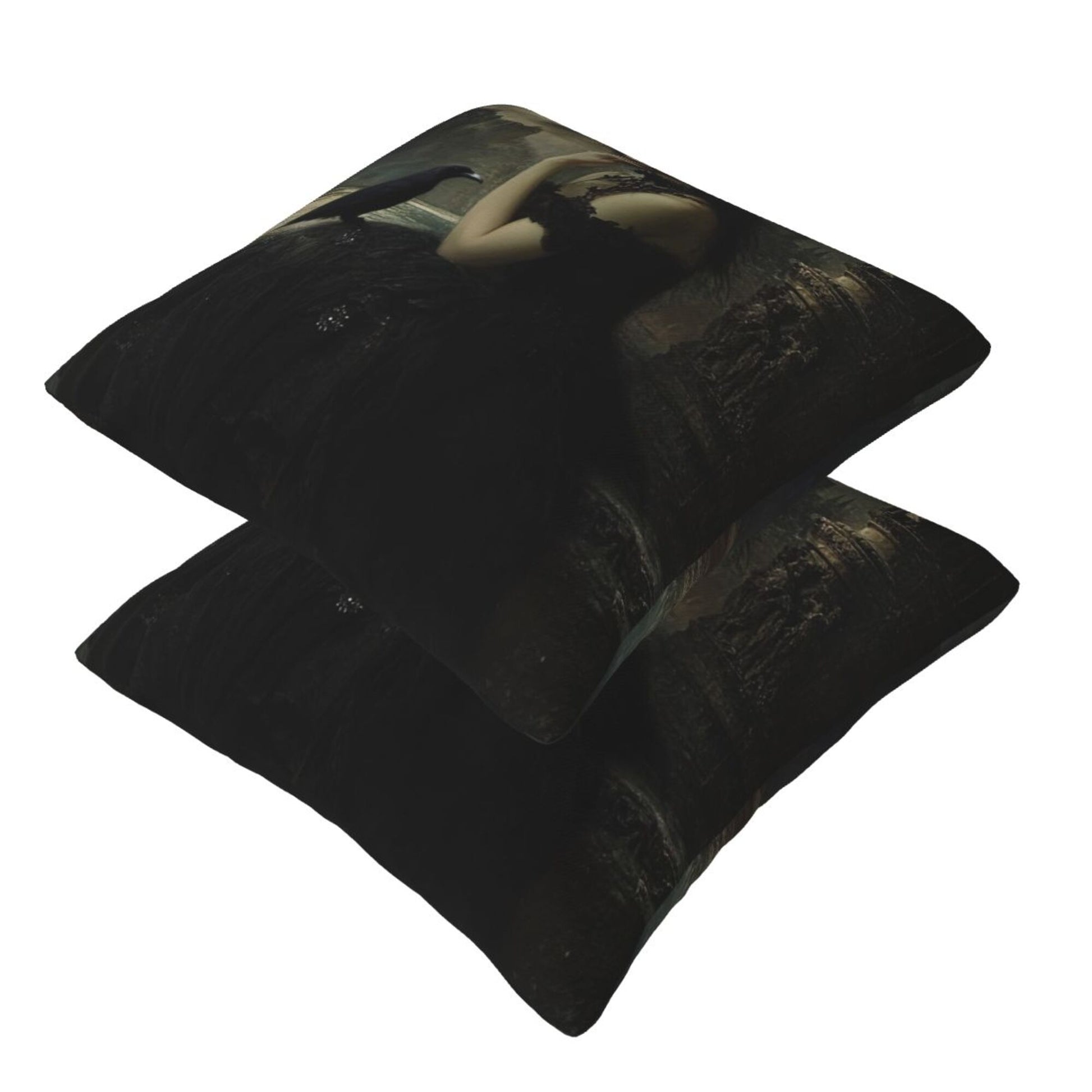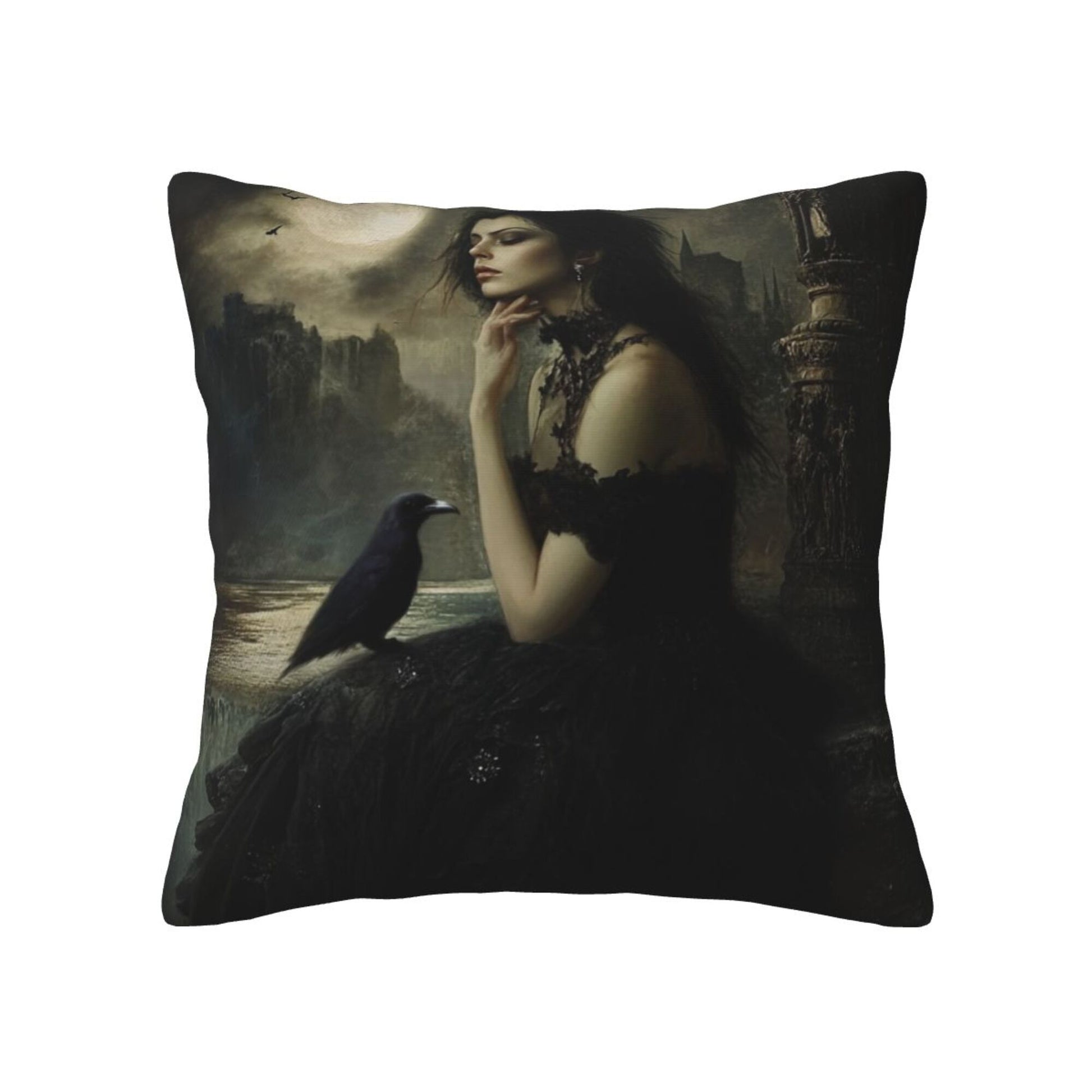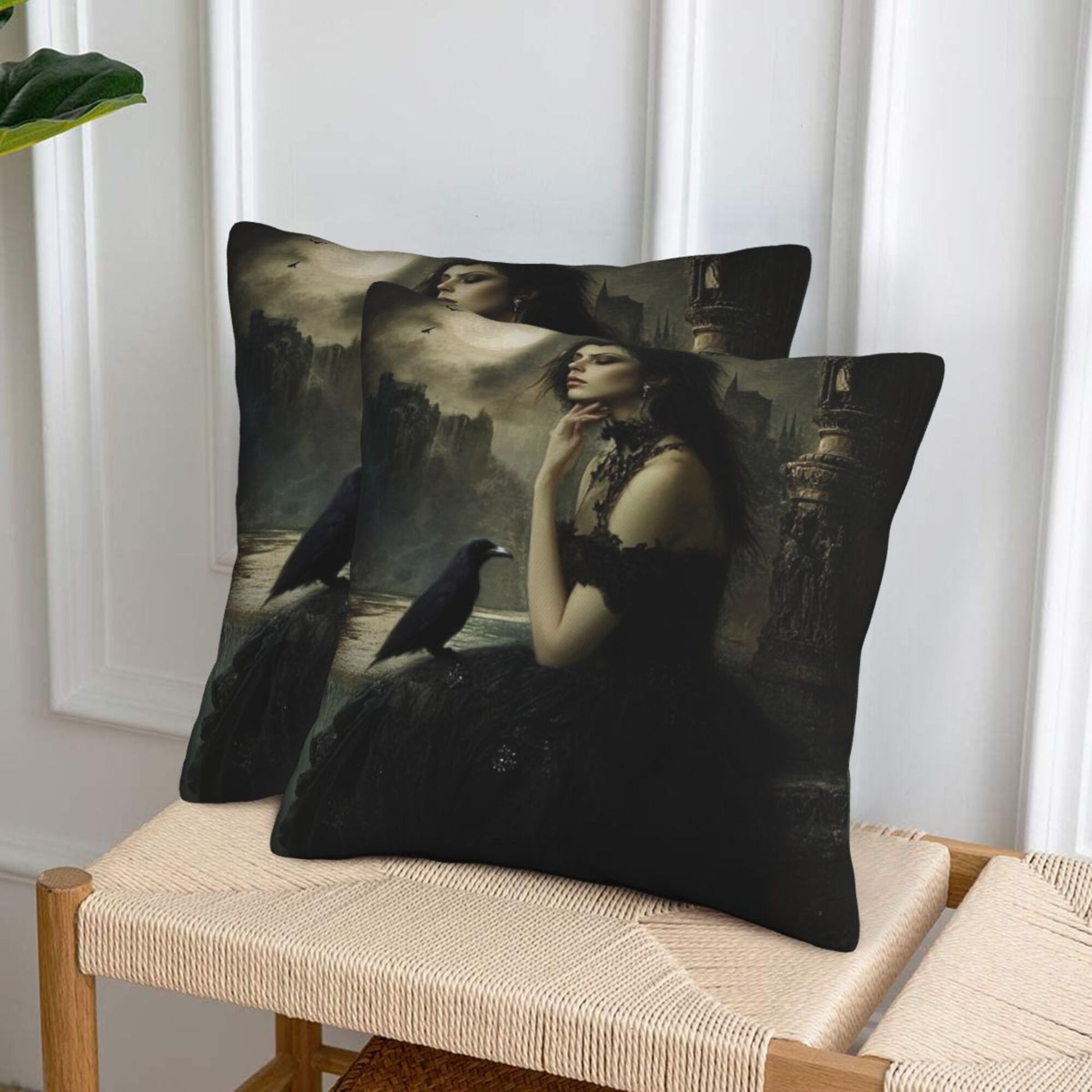Bring a touch of dark fantasy into your space with this stunning set of gothic-style pillow covers. The artwork showcases a hauntingly elegant woman in black lace, seated against a crumbling backdrop under the moonlight. A raven perches by her side, evoking a sense of mystery and quiet power. The scene fuses romantic melancholy with gothic grandeur, perfect for lovers of dark aesthetic and artistic storytelling.