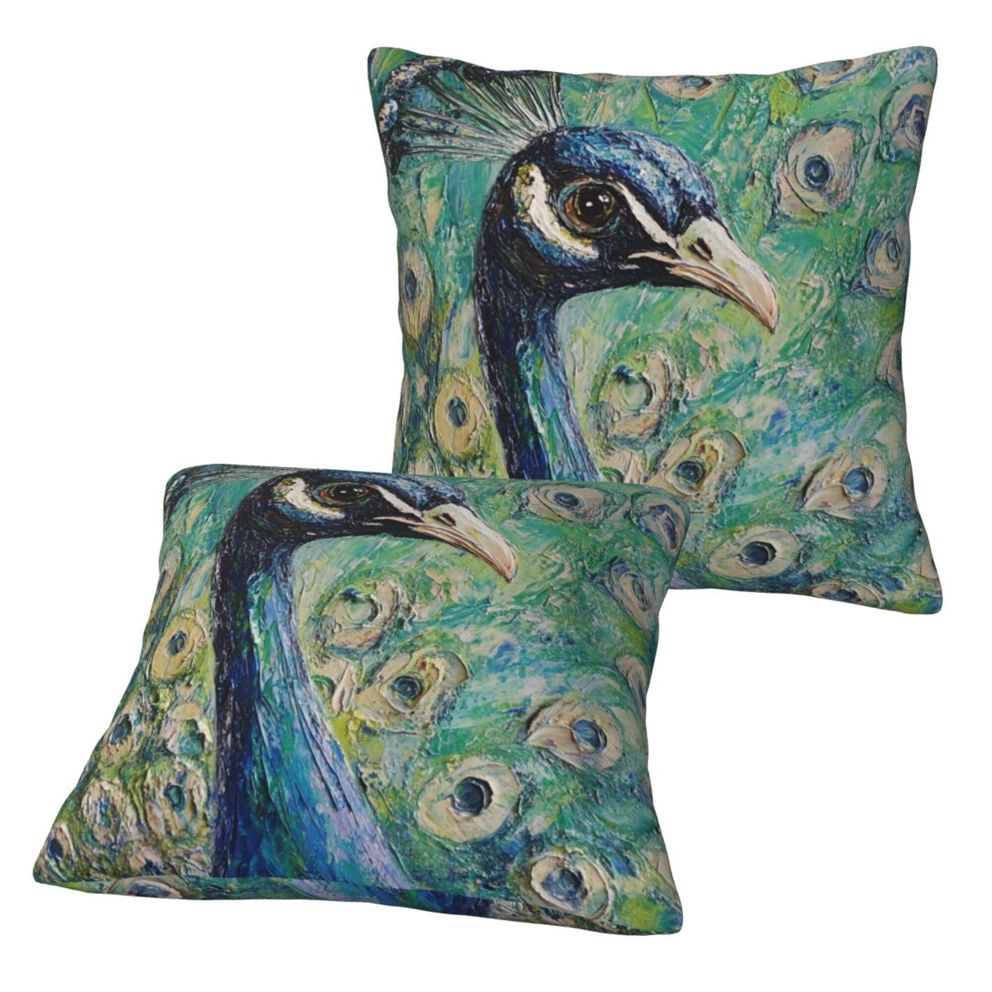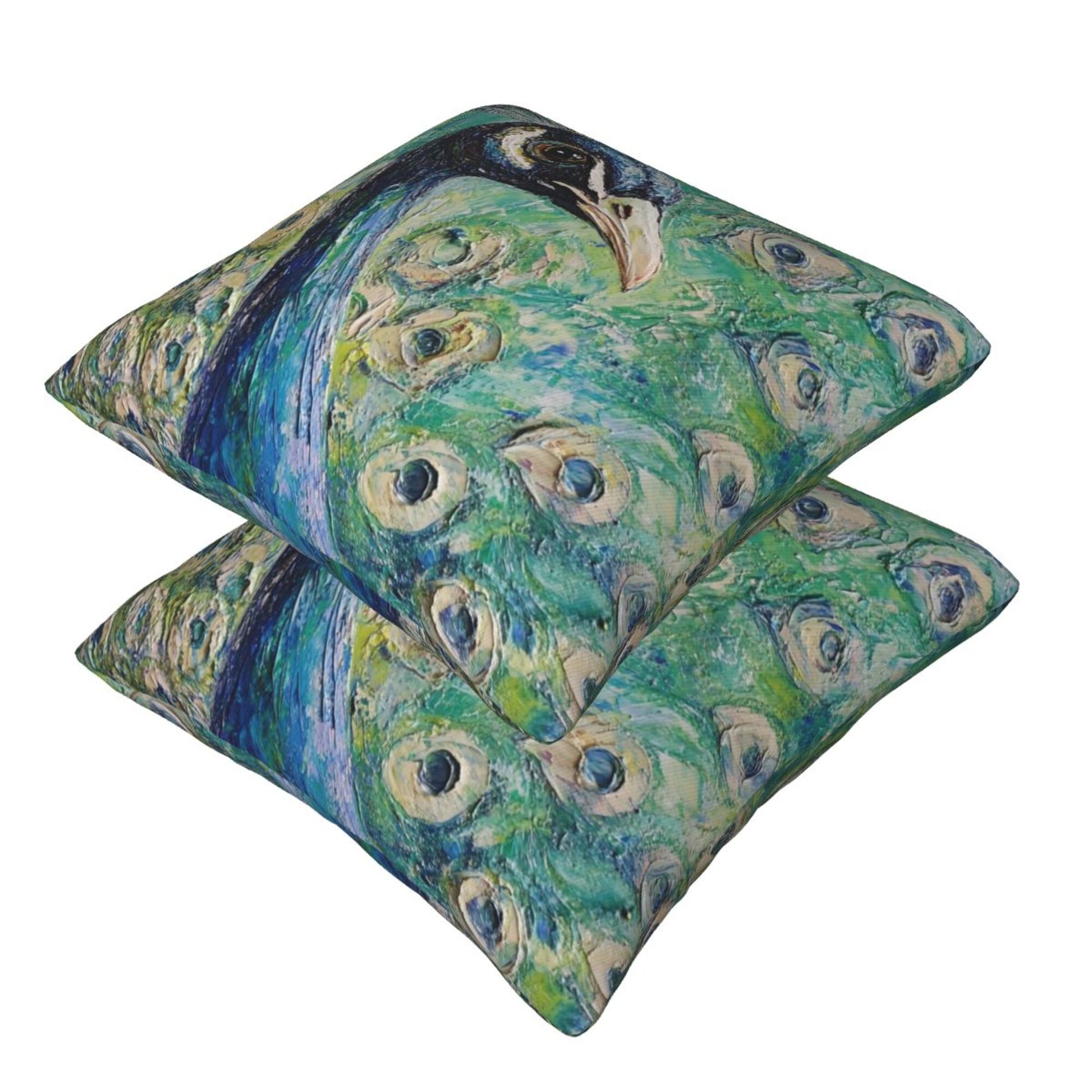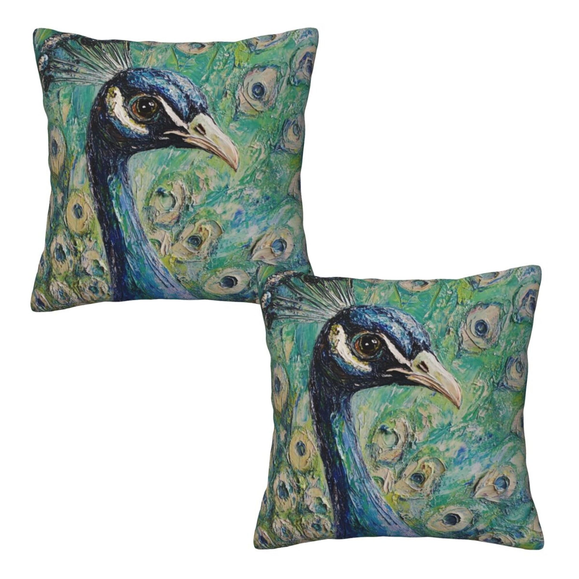 Bring elegance and artistic flair to your living space with this set of peacock-themed pillow covers. Inspired by oil painting techniques, the design captures the regal beauty of a majestic peacock in rich, layered strokes and vivid color gradients. The central figure of the peacock gazes calmly forward, its feathers fanning out in stunning detail—each “eye” spot delicately highlighted to add movement and realism. The emerald-green and turquoise background evokes a lush, garden-like atmosphere, making this cushion cover a true work of art that breathes life into any space.