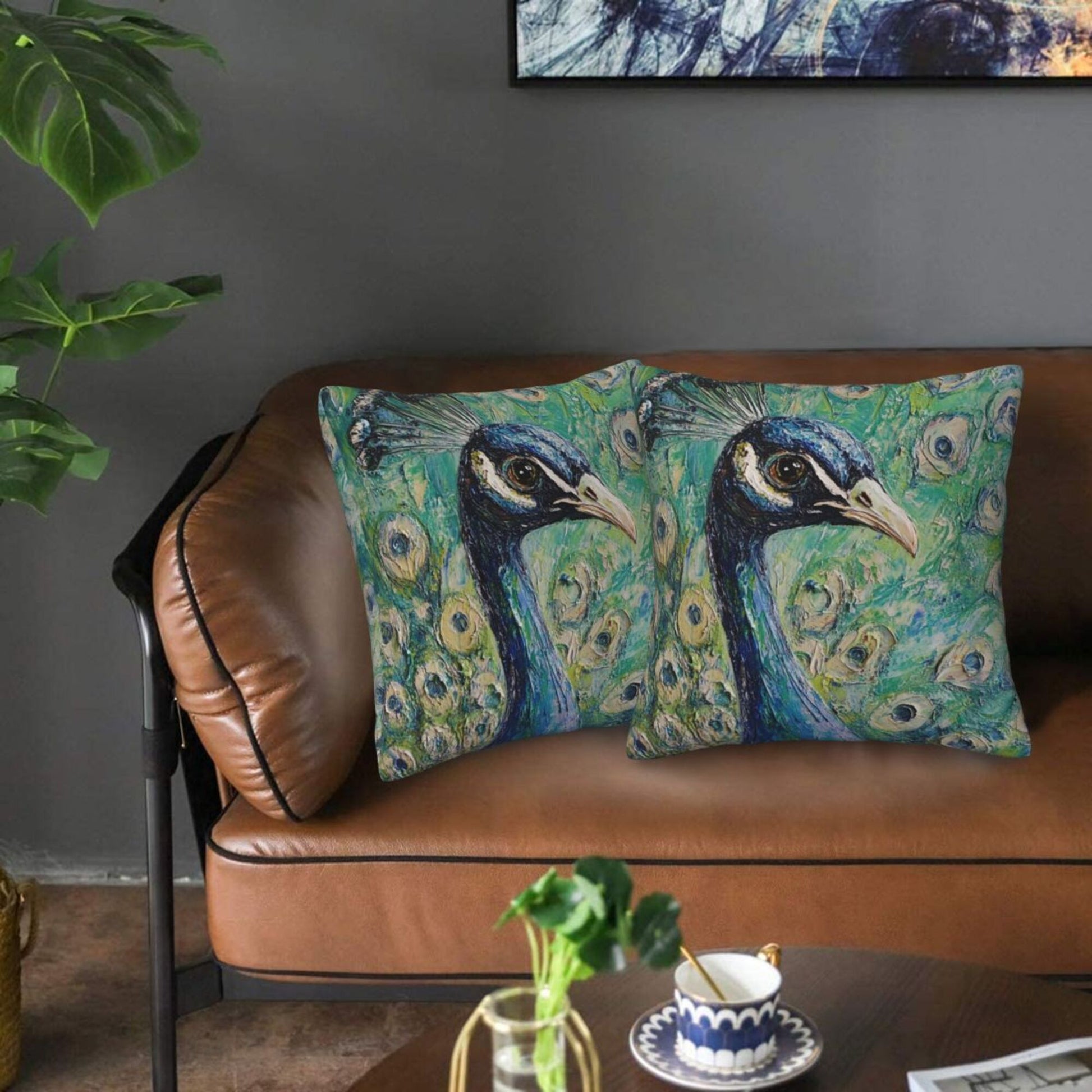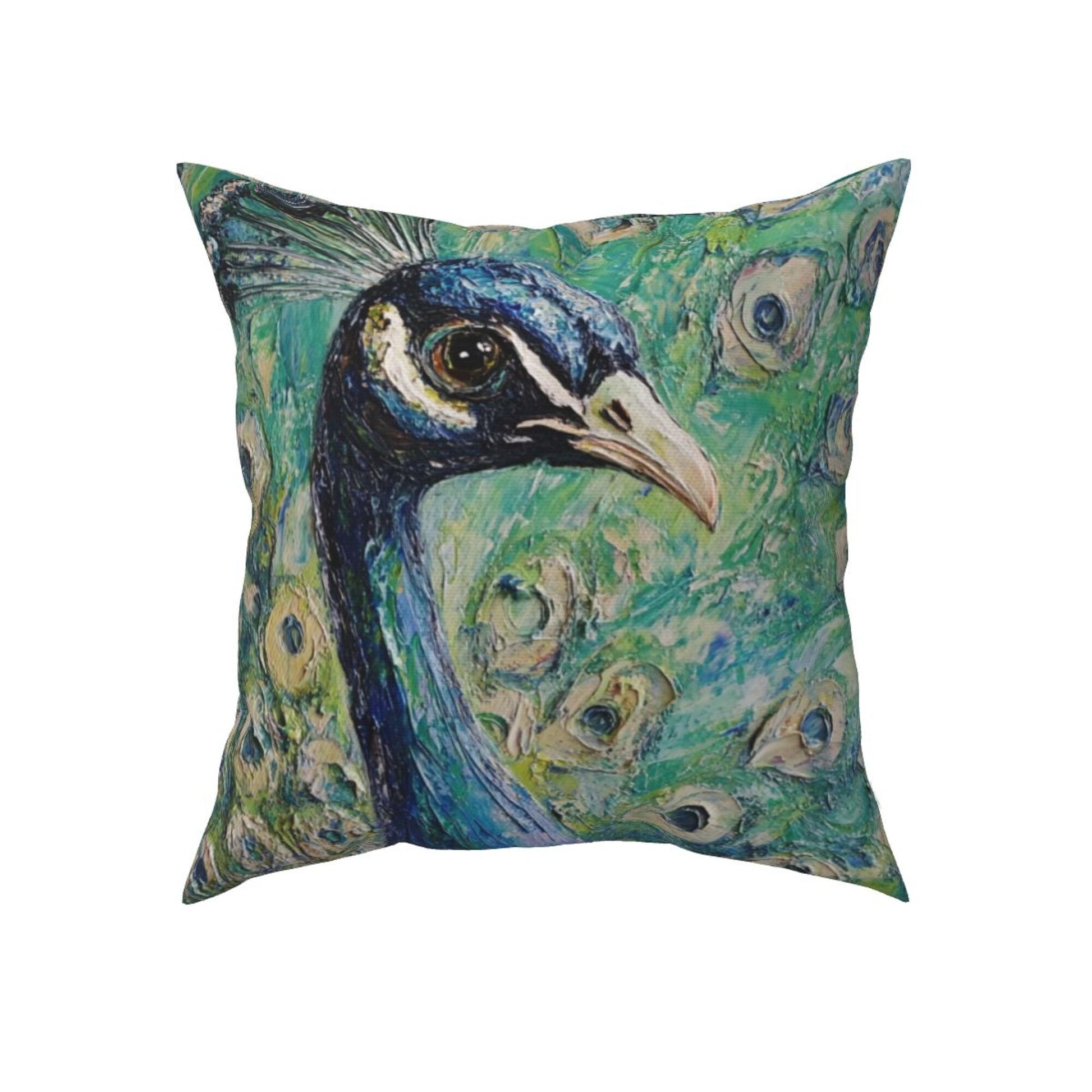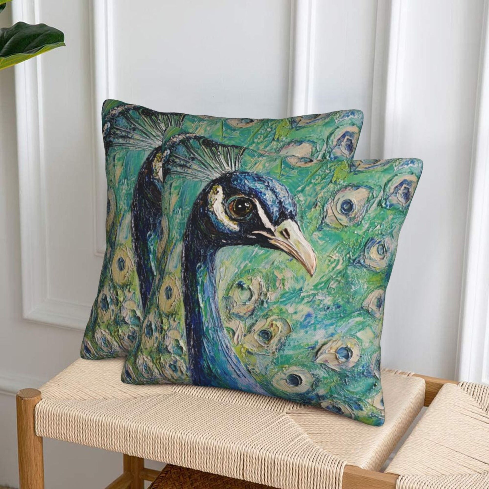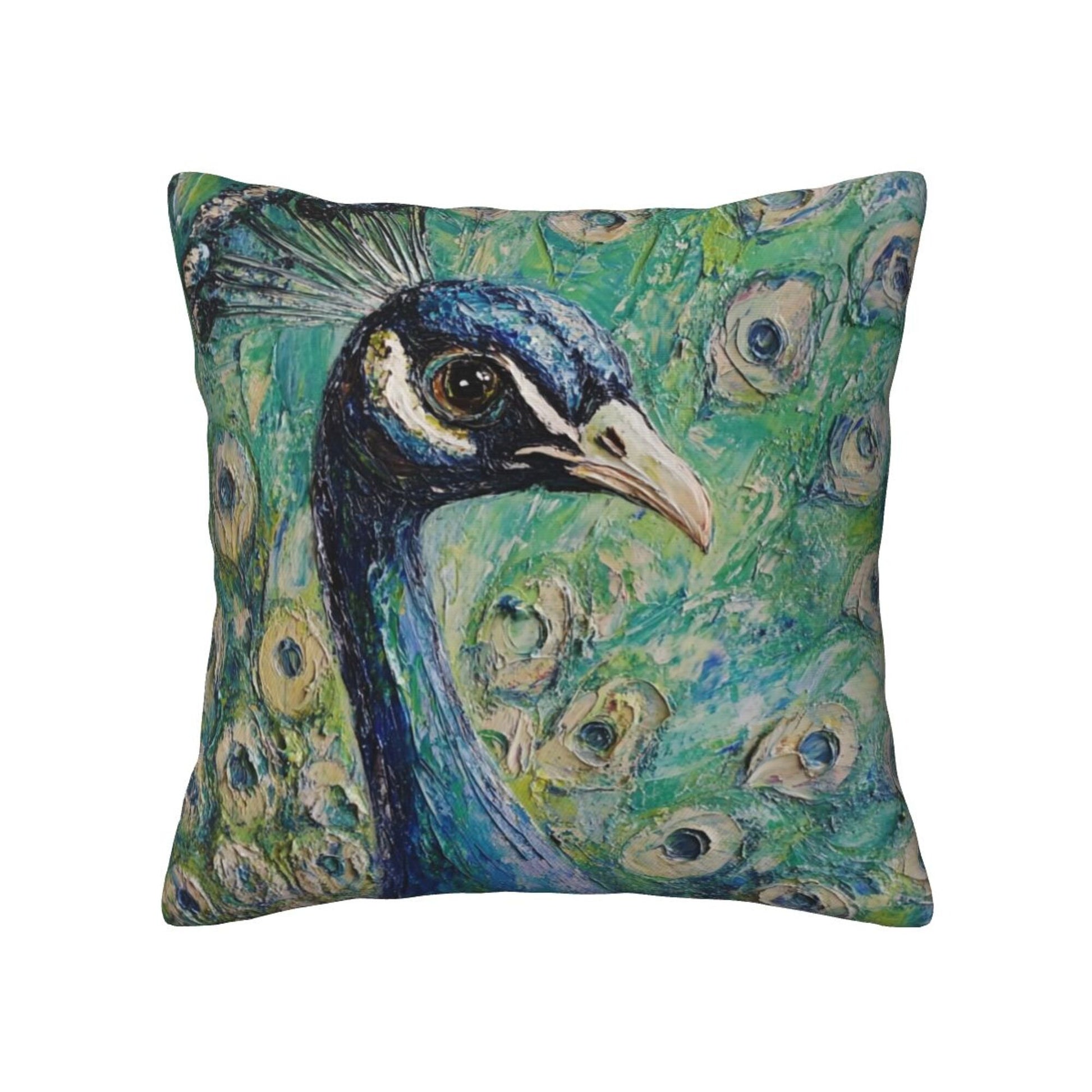 Bring elegance and artistic flair to your living space with this set of peacock-themed pillow covers. Inspired by oil painting techniques, the design captures the regal beauty of a majestic peacock in rich, layered strokes and vivid color gradients. The central figure of the peacock gazes calmly forward, its feathers fanning out in stunning detail—each “eye” spot delicately highlighted to add movement and realism. The emerald-green and turquoise background evokes a lush, garden-like atmosphere, making this cushion cover a true work of art that breathes life into any space.